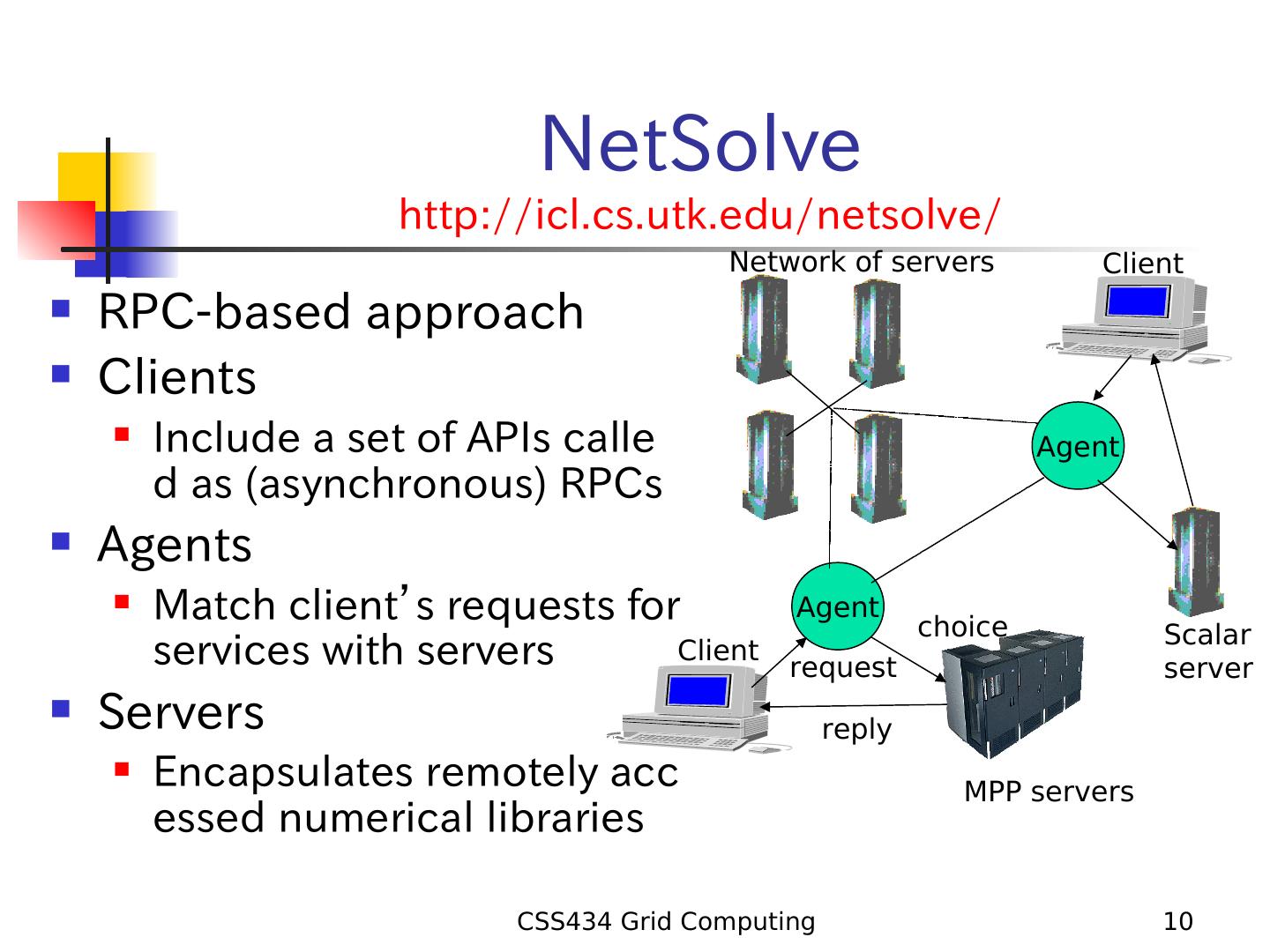 10 . NetSolve http://icl.cs.utk.edu/netsolve/ Network of servers Client RPC-based approach Clients Include a set of APIs calle Agent d as (asynchronous) RPCs Agents Match client’s requests for Agent choice Scalar services with servers Client request server Servers reply Encapsulates remotely acc MPP servers essed numerical libraries CSS434 Grid Computing 10
