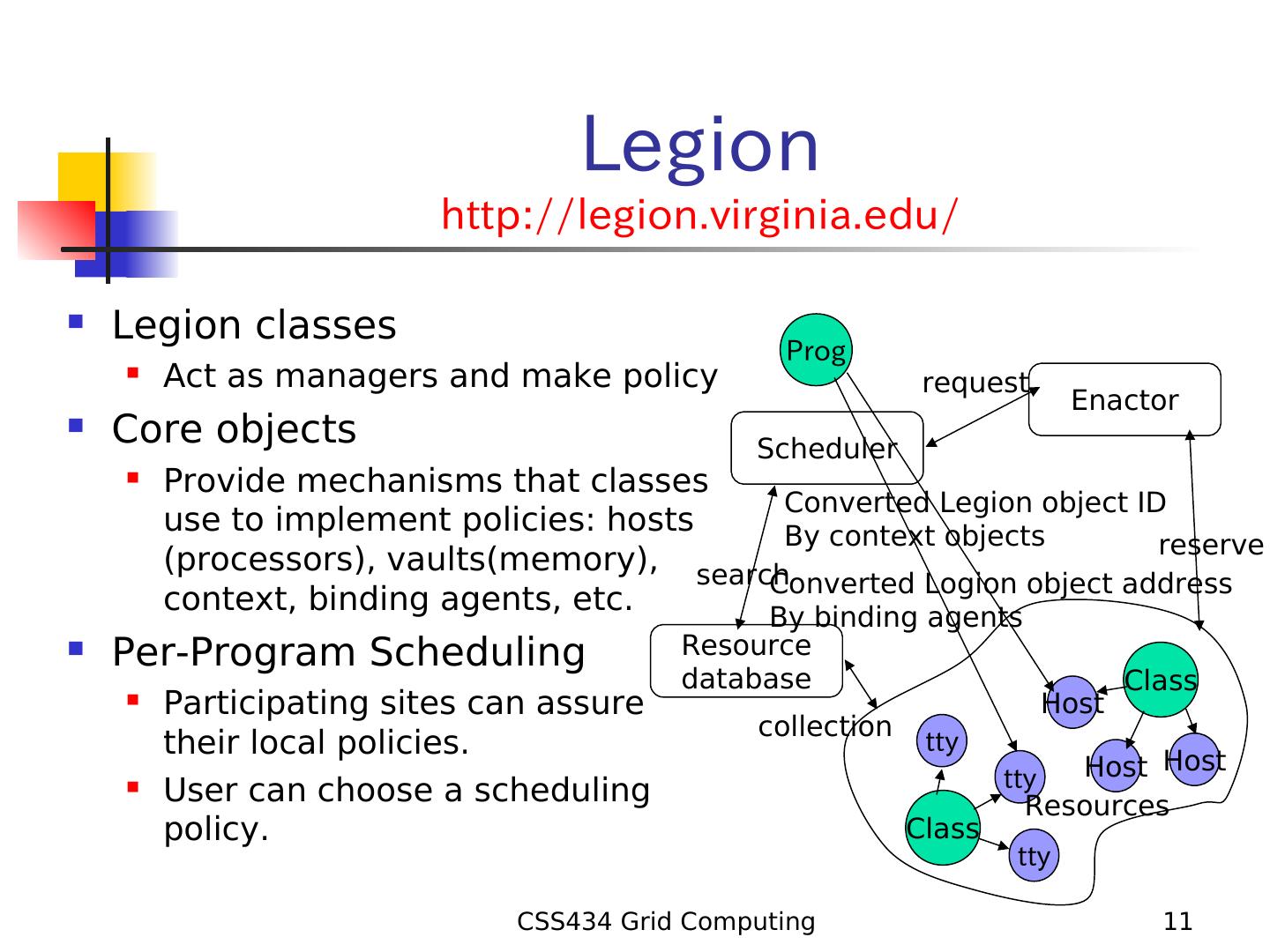 11 . Legion http://legion.virginia.edu/ Legion classes Prog Act as managers and make policy request Enactor Core objects Scheduler Provide mechanisms that classes Converted Legion object ID use to implement policies: hosts By context objects reserve (processors), vaults(memory), search Converted Logion object address context, binding agents, etc. By binding agents Per-Program Scheduling Resource database Class Participating sites can assure Host collection their local policies. tty tty Host Host User can choose a scheduling Resources policy. Class tty CSS434 Grid Computing 11