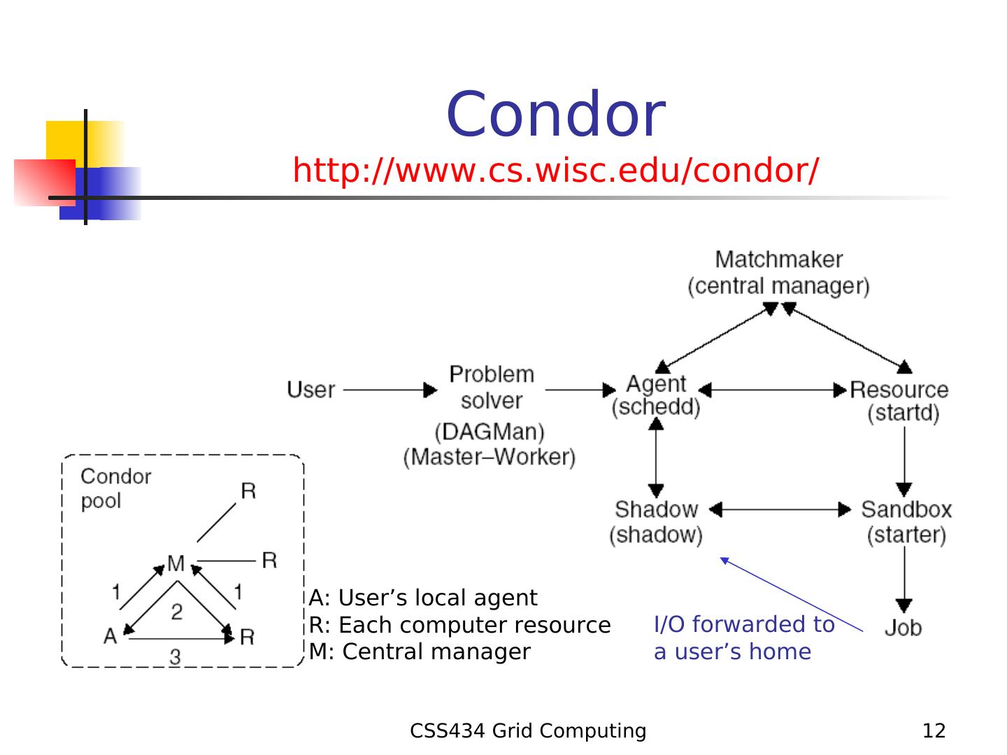 12 . Condor http://www.cs.wisc.edu/condor/ A: User’s local agent R: Each computer resource I/O forwarded to M: Central manager a user’s home CSS434 Grid Computing 12