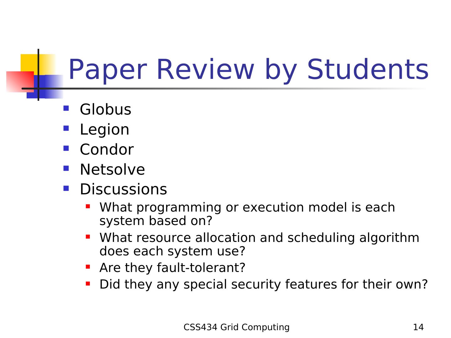 14 .Paper Review by Students Globus Legion Condor Netsolve Discussions What programming or execution model is each system based on? What resource allocation and scheduling algorithm does each system use? Are they fault-tolerant? Did they any special security features for their own? CSS434 Grid Computing 14