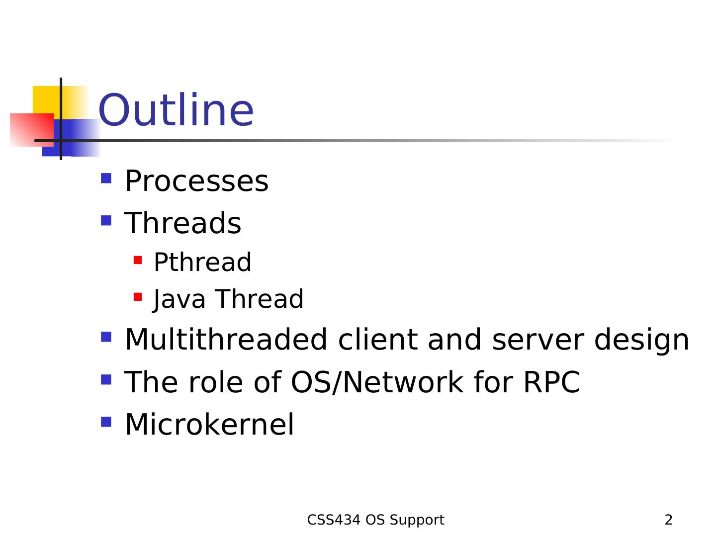 2 .Outline Processes Threads Pthread Java Thread Multithreaded client and server design The role of OS/Network for RPC Microkernel CSS434 OS Support 2