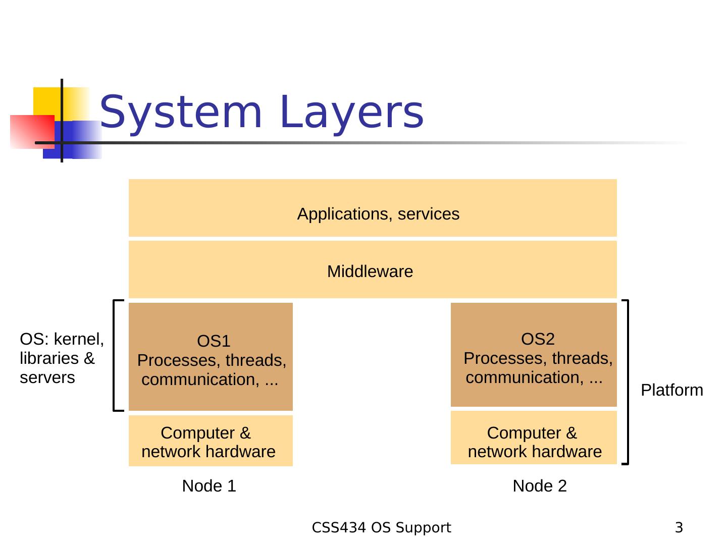 3 . System Layers Applications, services Middleware OS: kernel, OS1 OS2 libraries & Processes, threads, Processes, threads, servers communication, ... communication, ... Platform Computer & Computer & network hardware network hardware Node 1 Node 2 CSS434 OS Support 3