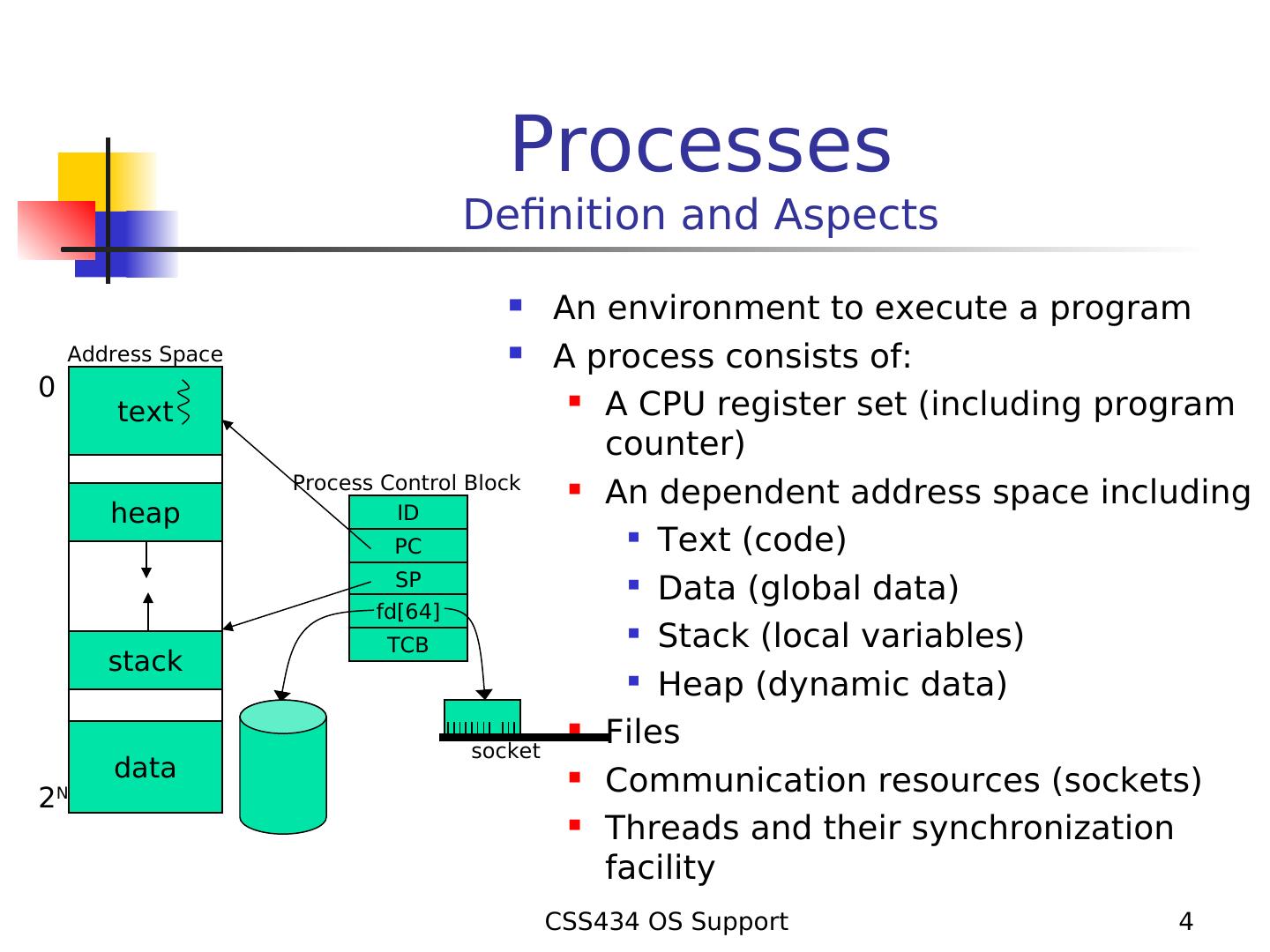 4 . Processes Definition and Aspects An environment to execute a program Address Space A process consists of: 0 A CPU register set (including program text counter) Process Control Block An dependent address space including heap ID PC Text (code) SP Data (global data) fd[64] TCB Stack (local variables) stack Heap (dynamic data) Files socket data Communication resources (sockets) 2N Threads and their synchronization facility CSS434 OS Support 4