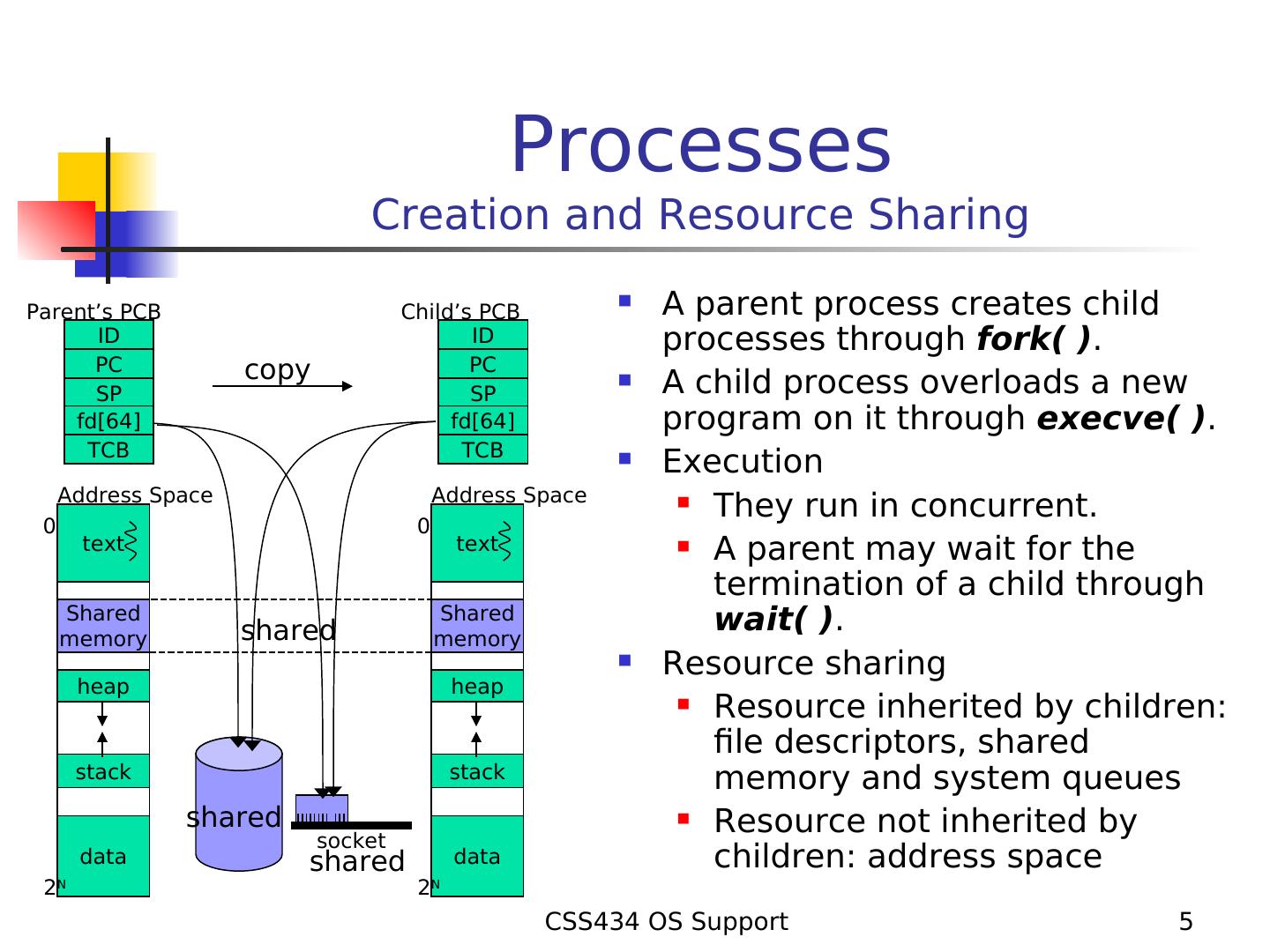 5 . Processes Creation and Resource Sharing Parent’s PCB Child’s PCB A parent process creates child ID ID processes through fork( ). PC copy PC SP SP A child process overloads a new fd[64] fd[64] program on it through execve( ). TCB TCB Execution Address Space Address Space They run in concurrent. 0 0 text text A parent may wait for the termination of a child through Shared memory shared Shared memory wait( ). Resource sharing heap heap Resource inherited by children: file descriptors, shared stack stack memory and system queues shared Resource not inherited by socket data shared data children: address space 2N 2N CSS434 OS Support 5
