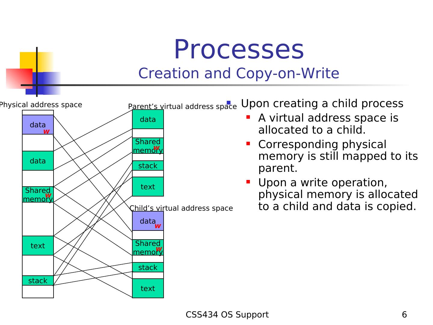 6 . Processes Creation and Copy-on-Write Physical address space Parent’s virtual address space Upon creating a child process data A virtual address space is data w allocated to a child. Shared Corresponding physical w memory data memory is still mapped to its stack parent. Upon a write operation, Shared text w memory physical memory is allocated Child’s virtual address space to a child and data is copied. data ww text Shared w memory stack stack text CSS434 OS Support 6