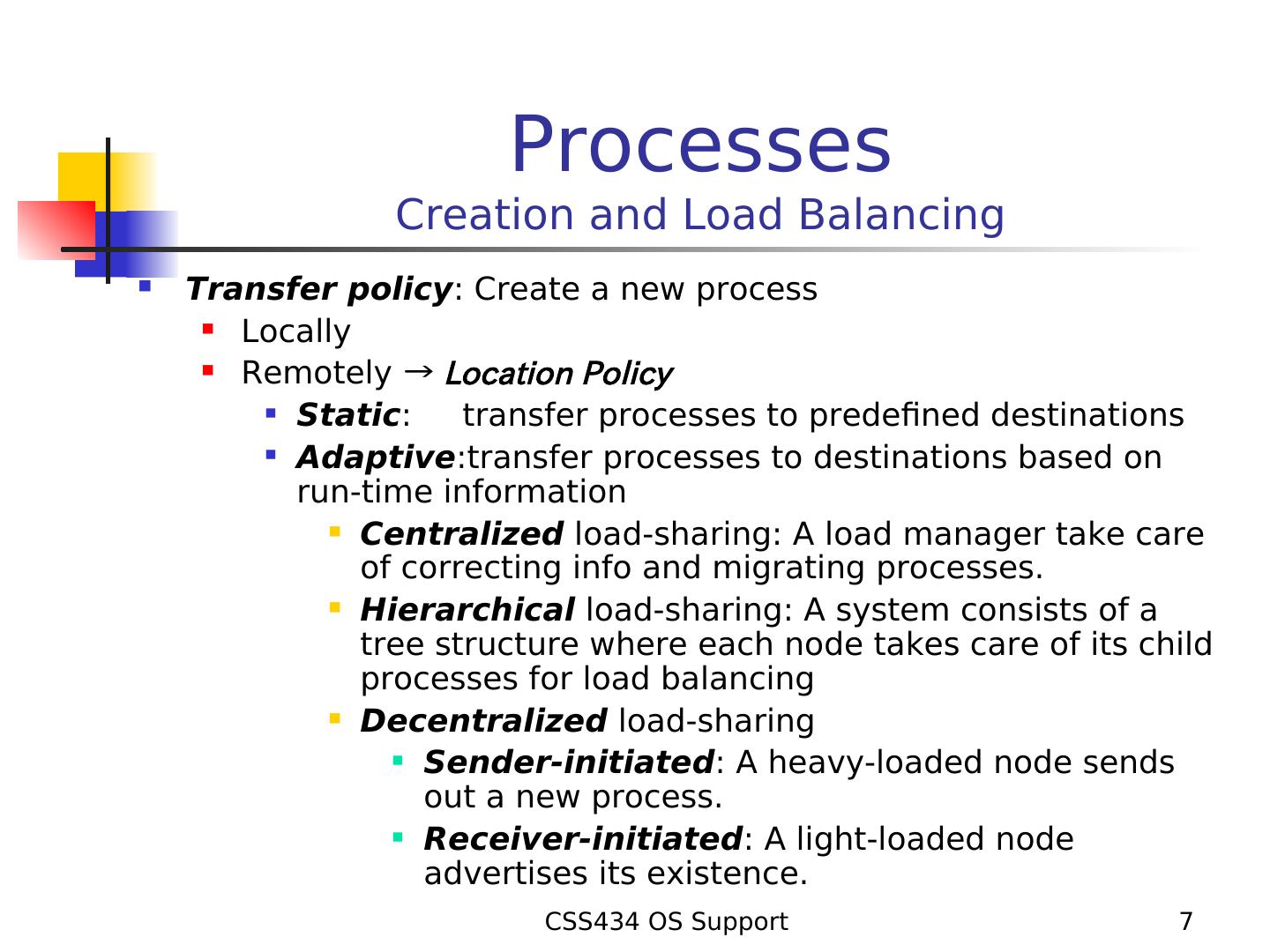 7 . Processes Creation and Load Balancing Transfer policy: Create a new process Locally Remotely → Location Policy Static: transfer processes to predefined destinations Adaptive:transfer processes to destinations based on run-time information Centralized load-sharing: A load manager take care of correcting info and migrating processes. Hierarchical load-sharing: A system consists of a tree structure where each node takes care of its child processes for load balancing Decentralized load-sharing Sender-initiated: A heavy-loaded node sends out a new process. Receiver-initiated: A light-loaded node advertises its existence. CSS434 OS Support 7