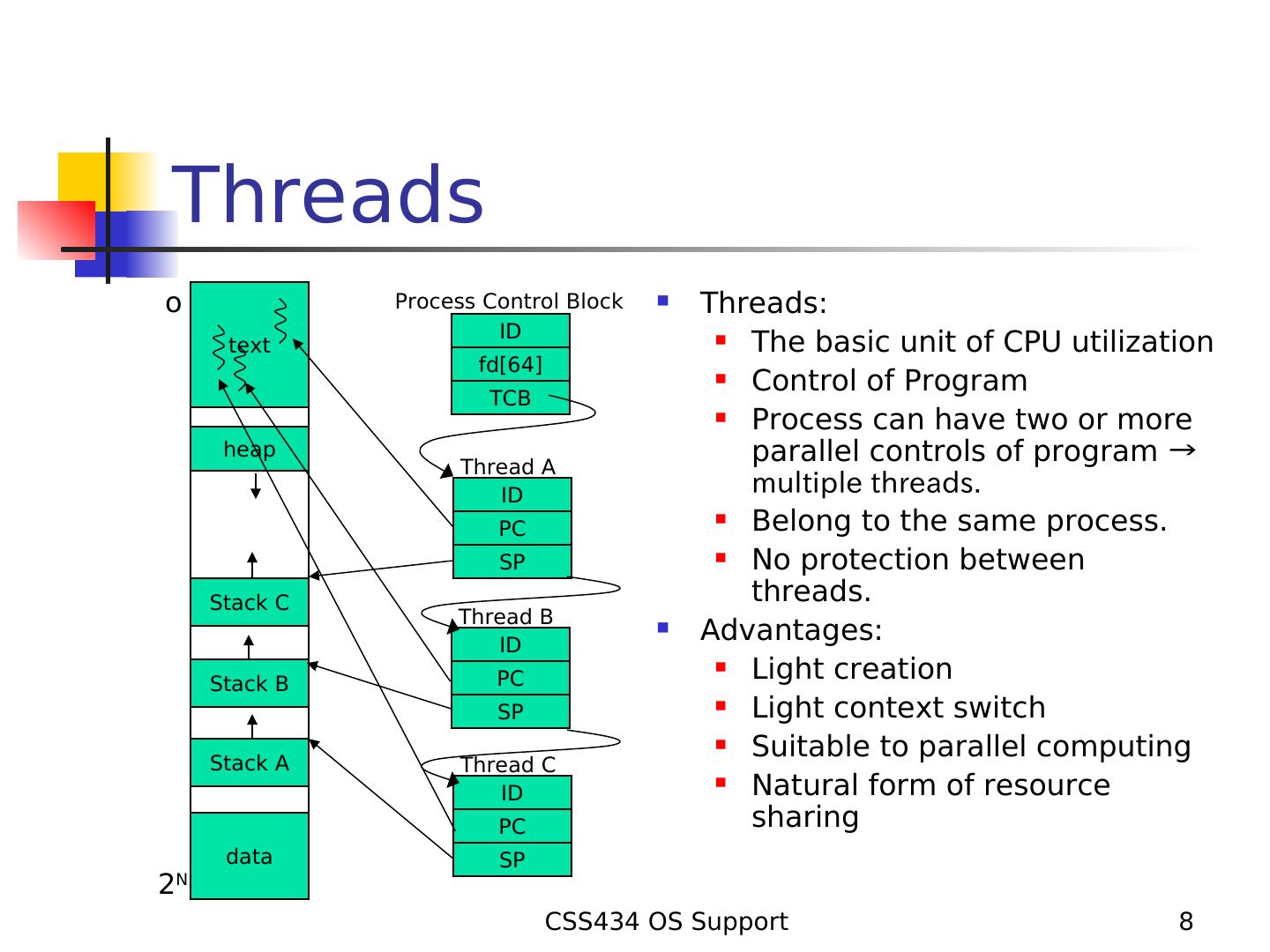 8 .Threads o Process Control Block Threads: ID text The basic unit of CPU utilization fd[64] Control of Program TCB Process can have two or more heap Thread A parallel controls of program → ID multiple threads. PC Belong to the same process. SP No protection between Stack C threads. Thread B ID Advantages: Stack B PC Light creation SP Light context switch Stack A Suitable to parallel computing Thread C ID Natural form of resource PC sharing data SP 2 N CSS434 OS Support 8