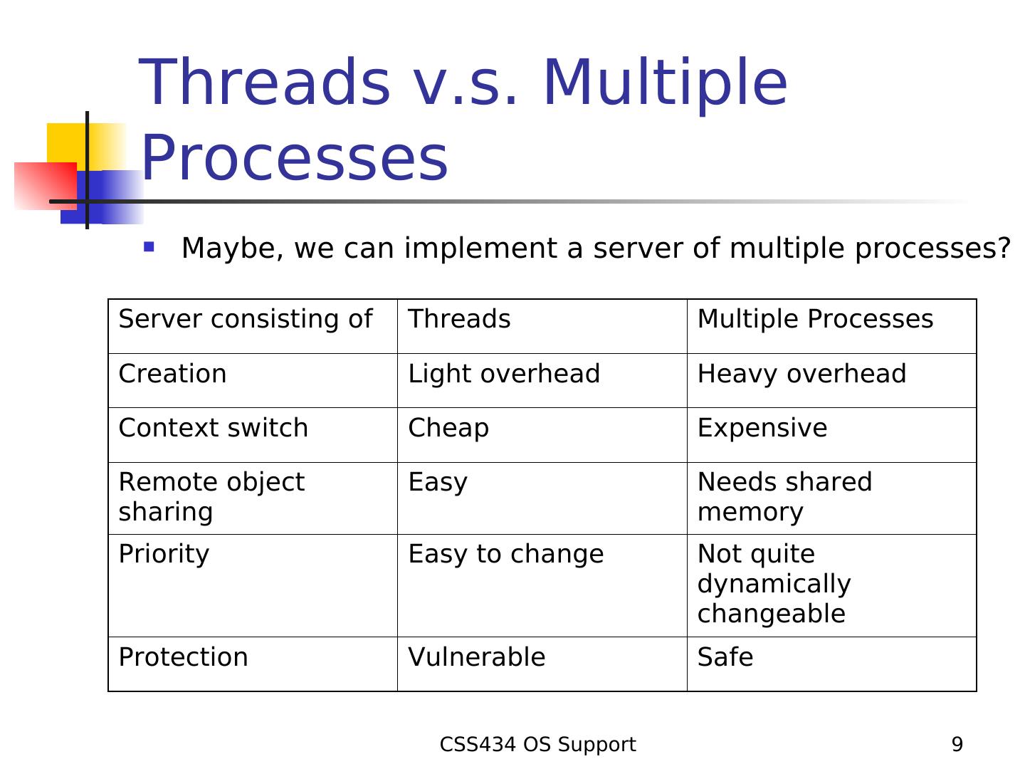 9 . Threads v.s. Multiple Processes Maybe, we can implement a server of multiple processes? Server consisting of Threads Multiple Processes Creation Light overhead Heavy overhead Context switch Cheap Expensive Remote object Easy Needs shared sharing memory Priority Easy to change Not quite dynamically changeable Protection Vulnerable Safe CSS434 OS Support 9