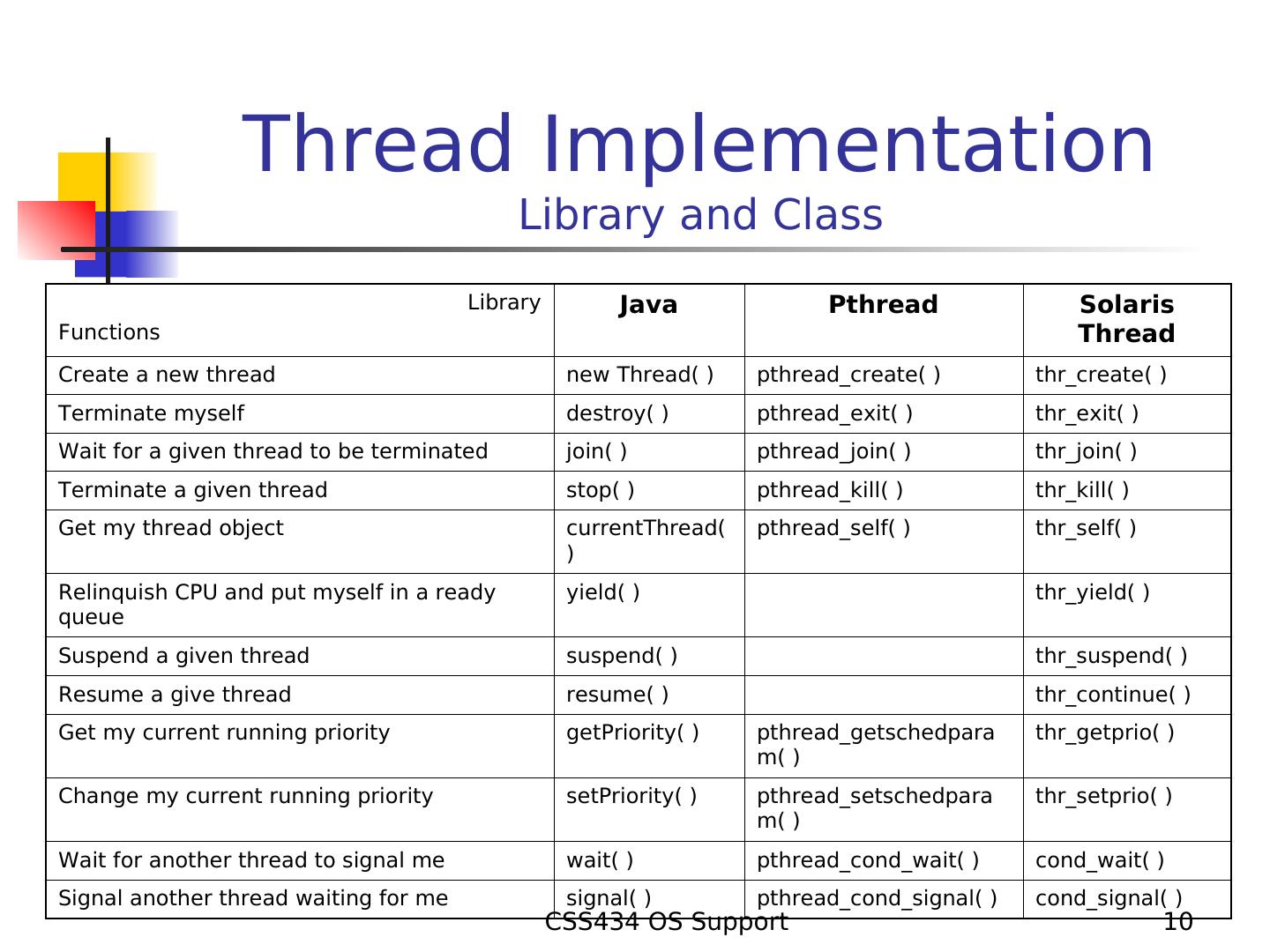 10 . Thread Implementation Library and Class Library Java Pthread Solaris Functions Thread Create a new thread new Thread( ) pthread_create( ) thr_create( ) Terminate myself destroy( ) pthread_exit( ) thr_exit( ) Wait for a given thread to be terminated join( ) pthread_join( ) thr_join( ) Terminate a given thread stop( ) pthread_kill( ) thr_kill( ) Get my thread object currentThread( pthread_self( ) thr_self( ) ) Relinquish CPU and put myself in a ready yield( ) thr_yield( ) queue Suspend a given thread suspend( ) thr_suspend( ) Resume a give thread resume( ) thr_continue( ) Get my current running priority getPriority( ) pthread_getschedpara thr_getprio( ) m( ) Change my current running priority setPriority( ) pthread_setschedpara thr_setprio( ) m( ) Wait for another thread to signal me wait( ) pthread_cond_wait( ) cond_wait( ) Signal another thread waiting for me signal( ) pthread_cond_signal( ) cond_signal( ) CSS434 OS Support 10