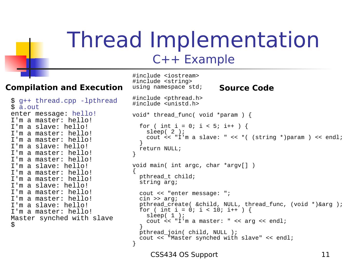 11 . Thread Implementation C++ Example #include <iostream> #include <string> Compilation and Execution using namespace std; Source Code $ g++ thread.cpp -lpthread #include <pthread.h> #include <unistd.h> $ a.out enter message: hello! void* thread_func( void *param ) { I'm a master: hello! I'm a slave: hello! for ( int i = 0; i < 5; i++ ) { I'm a master: hello! sleep( 2 ); I'm a master: hello! cout << "I'm a slave: " << *( (string *)param ) << endl; } I'm a slave: hello! return NULL; I'm a master: hello! } I'm a master: hello! I'm a slave: hello! void main( int argc, char *argv[] ) I'm a master: hello! { I'm a master: hello! pthread_t child; string arg; I'm a slave: hello! I'm a master: hello! cout << "enter message: "; I'm a master: hello! cin >> arg; I'm a slave: hello! pthread_create( &child, NULL, thread_func, (void *)&arg ); I'm a master: hello! for ( int i = 0; i < 10; i++ ) { Master synched with slave sleep( 1 ); cout << "I'm a master: " << arg << endl; $ } pthread_join( child, NULL ); cout << "Master synched with slave" << endl; } CSS434 OS Support 11