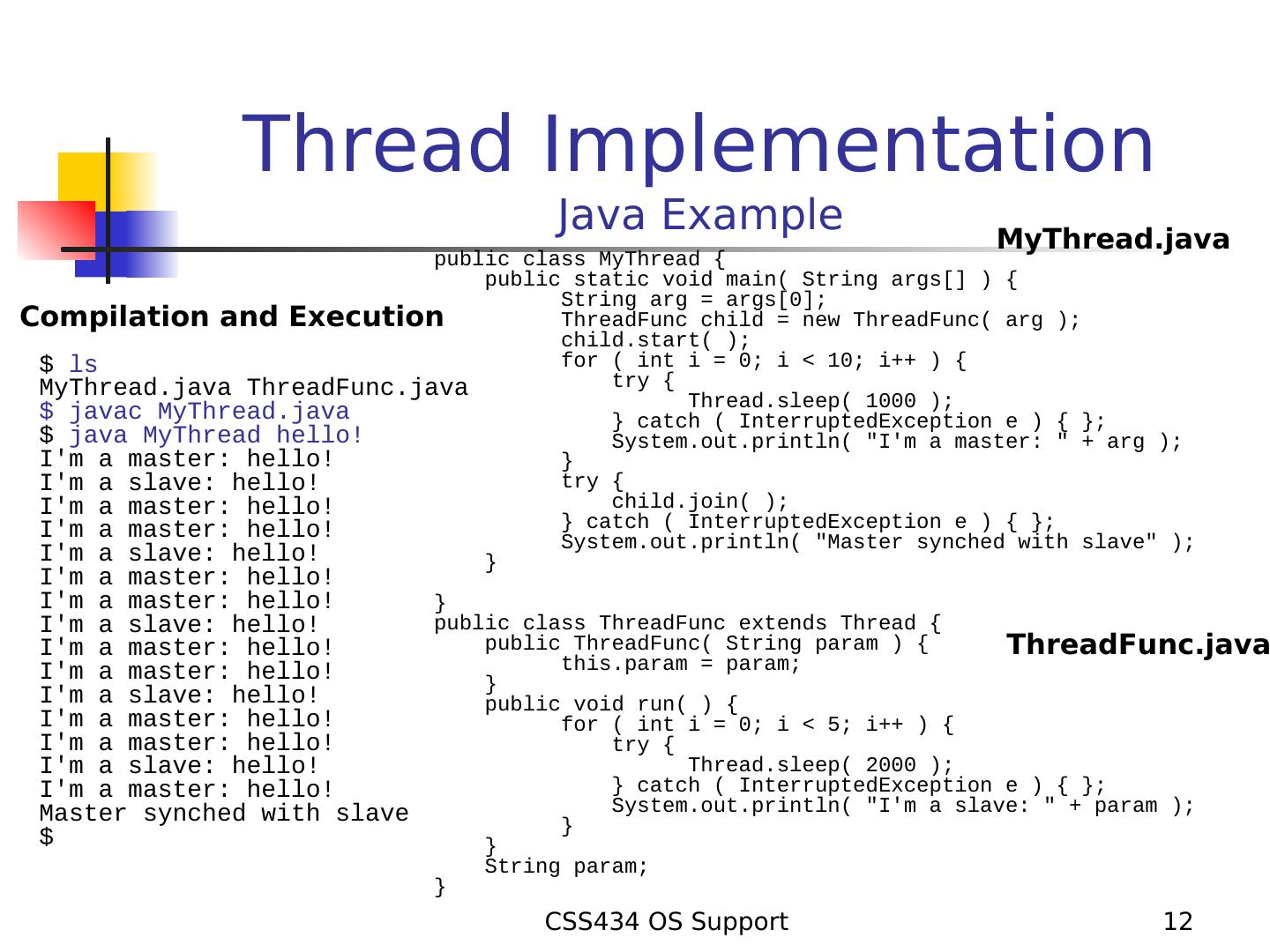 12 . Thread Implementation Java Example MyThread.java public class MyThread { public static void main( String args[] ) { String arg = args[0]; Compilation and Execution ThreadFunc child = new ThreadFunc( arg ); child.start( ); $ ls for ( int i = 0; i < 10; i++ ) { MyThread.java ThreadFunc.java try { Thread.sleep( 1000 ); $ javac MyThread.java } catch ( InterruptedException e ) { }; $ java MyThread hello! System.out.println( "I'm a master: " + arg ); I'm a master: hello! } I'm a slave: hello! try { I'm a master: hello! child.join( ); I'm a master: hello! } catch ( InterruptedException e ) { }; System.out.println( "Master synched with slave" ); I'm a slave: hello! } I'm a master: hello! I'm a master: hello! } I'm a slave: hello! public class ThreadFunc extends Thread { I'm a master: hello! public ThreadFunc( String param ) { ThreadFunc.java I'm a master: hello! this.param = param; } I'm a slave: hello! public void run( ) { I'm a master: hello! for ( int i = 0; i < 5; i++ ) { I'm a master: hello! try { I'm a slave: hello! Thread.sleep( 2000 ); I'm a master: hello! } catch ( InterruptedException e ) { }; Master synched with slave System.out.println( "I'm a slave: " + param ); } $ } String param; } CSS434 OS Support 12