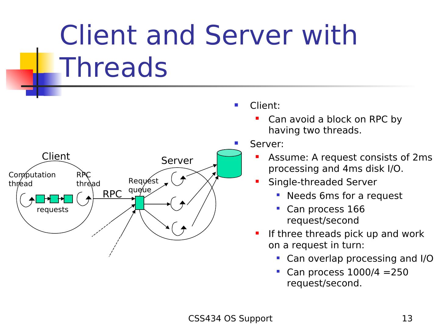 13 . Client and Server with Threads Client: Can avoid a block on RPC by having two threads. Server: Client Server Assume: A request consists of 2ms processing and 4ms disk I/O. Computation RPC thread thread Request Single-threaded Server queue RPC Needs 6ms for a request requests Can process 166 request/second If three threads pick up and work on a request in turn: Can overlap processing and I/O Can process 1000/4 =250 request/second. CSS434 OS Support 13