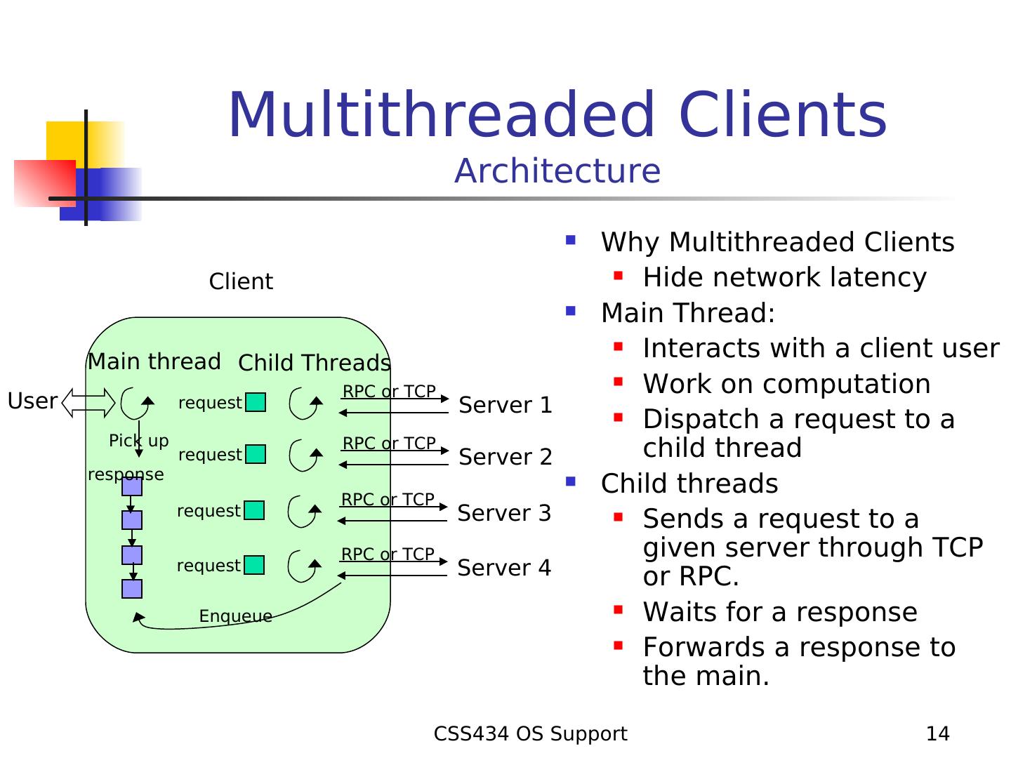14 . Multithreaded Clients Architecture Why Multithreaded Clients Hide network latency Client Main Thread: Interacts with a client user Main thread Child Threads Work on computation RPC or TCP User request Server 1 Dispatch a request to a Pick up request RPC or TCP Server 2 child thread response RPC or TCP Child threads request Server 3 Sends a request to a RPC or TCP given server through TCP request Server 4 or RPC. Enqueue Waits for a response Forwards a response to the main. CSS434 OS Support 14