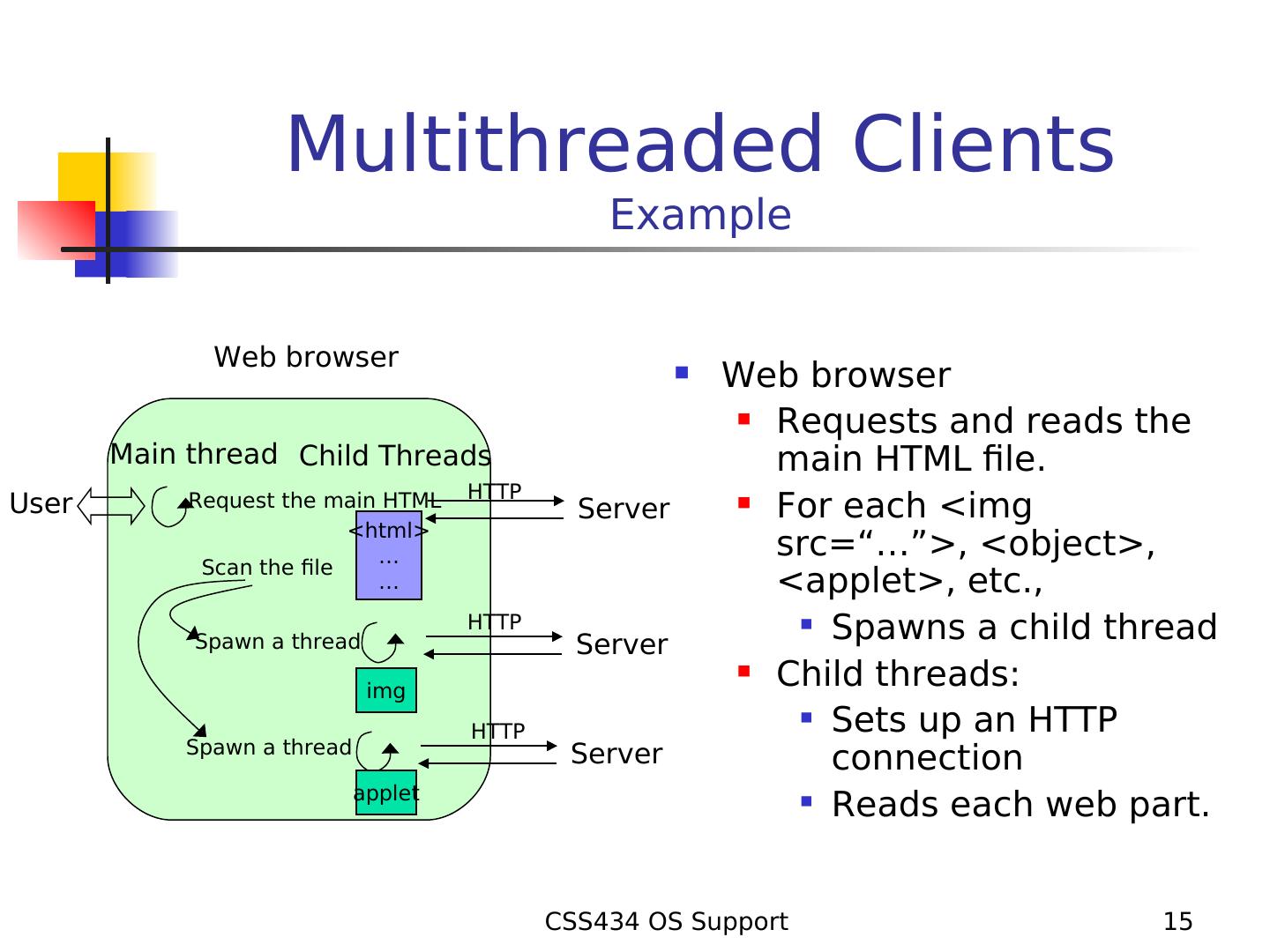 15 . Multithreaded Clients Example Web browser Web browser Requests and reads the Main thread Child Threads main HTML file. HTTP User Request the main HTML Server For each <img <html> … src=“…”>, <object>, Scan the file … <applet>, etc., HTTP Spawns a child thread Spawn a thread Server Child threads: img Sets up an HTTP HTTP Spawn a thread Server connection applet Reads each web part. CSS434 OS Support 15