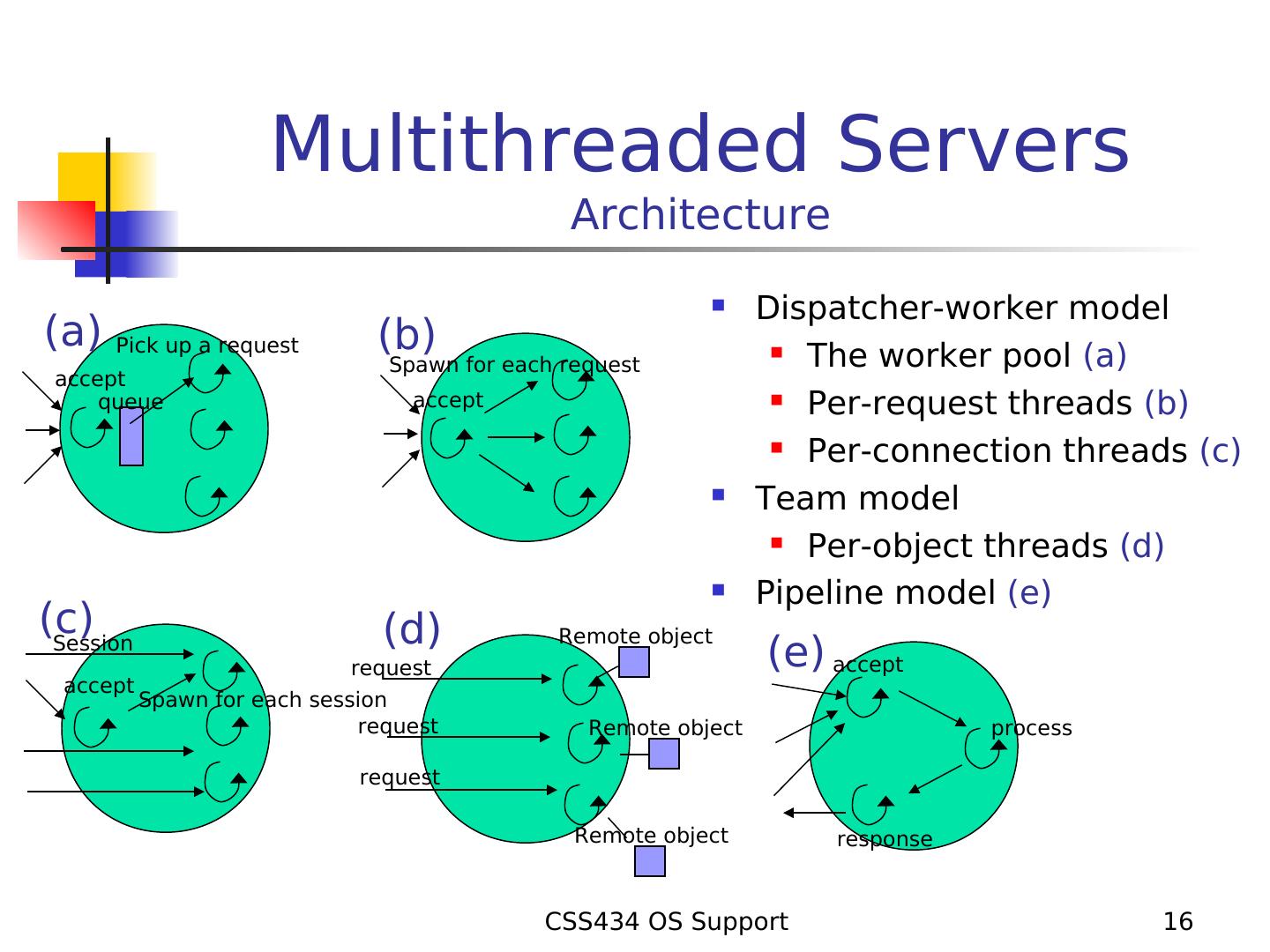 16 . Multithreaded Servers Architecture Dispatcher-worker model (a) Pick up a request (b) The worker pool (a) Spawn for each request accept queue accept Per-request threads (b) Per-connection threads (c) Team model Per-object threads (d) Pipeline model (e) (c) (d) Remote object Session request (e) accept accept Spawn for each session request Remote object process request Remote object response CSS434 OS Support 16