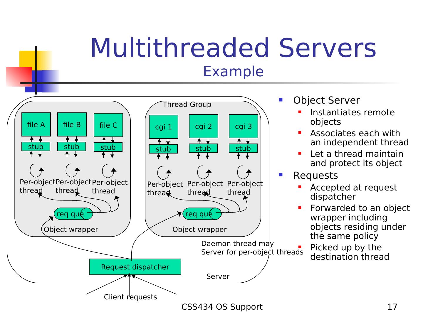 17 . Multithreaded Servers Example Thread Group Object Server Instantiates remote file A file B file C cgi 2 cgi 3 objects cgi 1 Associates each with stub stub an independent thread stub stub stub stub Let a thread maintain and protect its object Requests Per-objectPer-object Per-object Per-object Per-object Per-object thread thread thread thread thread Accepted at request thread dispatcher Forwarded to an object req que req que wrapper including Object wrapper Object wrapper objects residing under the same policy Daemon thread may Server for per-object threads Picked up by the destination thread Request dispatcher Server Client requests CSS434 OS Support 17