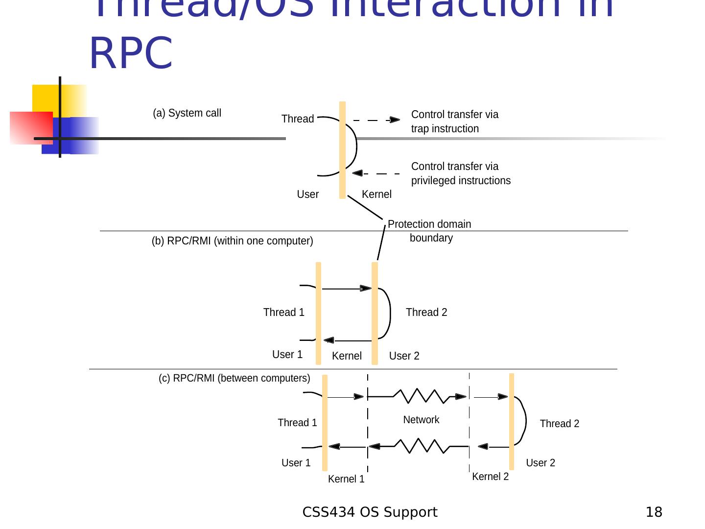 18 .Thread/OS Interaction in RPC (a) System call Thread Control transfer via trap instruction Control transfer via privileged instructions User Kernel Protection domain (b) RPC/RMI (within one computer) boundary Thread 1 Thread 2 User 1 Kernel User 2 (c) RPC/RMI (between computers) Thread 1 Network Thread 2 User 1 User 2 Kernel 1 Kernel 2 CSS434 OS Support 18