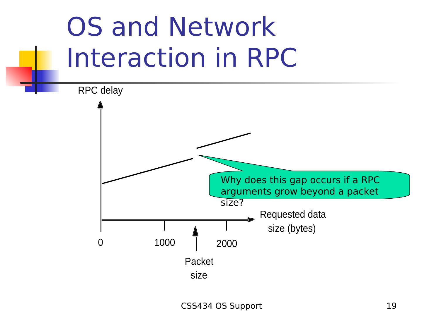 19 .OS and Network Interaction in RPC RPC delay Why does this gap occurs if a RPC arguments grow beyond a packet size? Requested data size (bytes) 0 1000 2000 Packet size CSS434 OS Support 19