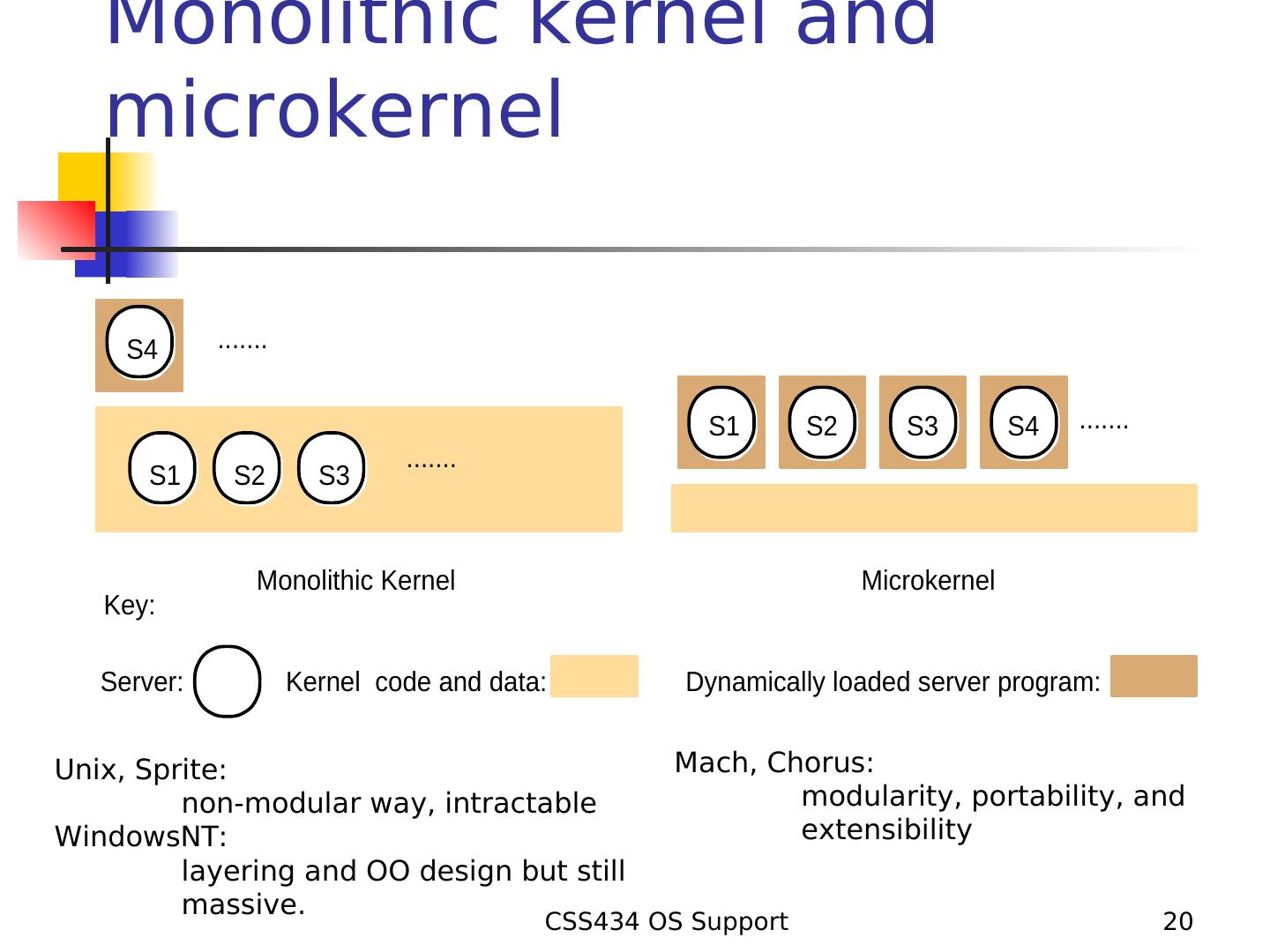 20 . Monolithic kernel and microkernel S4 ....... S1 S2 S3 S4 ....... ....... S1 S2 S3 Monolithic Kernel Microkernel Key: Server: Kernel code and data: Dynamically loaded server program: Unix, Sprite: Mach, Chorus: non-modular way, intractable modularity, portability, and WindowsNT: extensibility layering and OO design but still massive. CSS434 OS Support 20