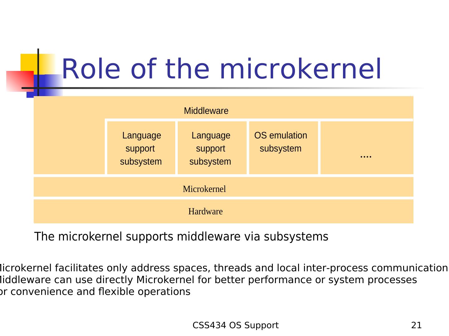 21 . Role of the microkernel Middleware Language Language OS emulation support support subsystem .... subsystem subsystem Microkernel Hardware The microkernel supports middleware via subsystems Microkernel facilitates only address spaces, threads and local inter-process communication. Middleware can use directly Microkernel for better performance or system processes or convenience and flexible operations CSS434 OS Support 21