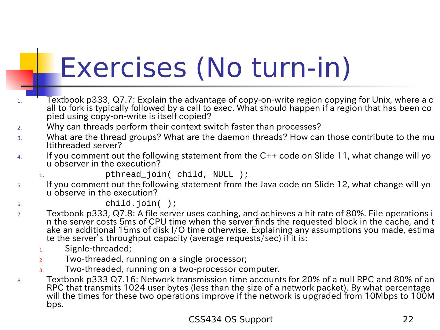 22 . Exercises (No turn-in) 1. Textbook p333, Q7.7: Explain the advantage of copy-on-write region copying for Unix, where a c all to fork is typically followed by a call to exec. What should happen if a region that has been co pied using copy-on-write is itself copied? 2. Why can threads perform their context switch faster than processes? 3. What are the thread groups? What are the daemon threads? How can those contribute to the mu ltithreaded server? 4. If you comment out the following statement from the C++ code on Slide 11, what change will yo u observer in the execution? 1. pthread_join( child, NULL ); 5. If you comment out the following statement from the Java code on Slide 12, what change will yo u observe in the execution? 6. child.join( ); 7. Textbook p333, Q7.8: A file server uses caching, and achieves a hit rate of 80%. File operations i n the server costs 5ms of CPU time when the server finds the requested block in the cache, and t ake an additional 15ms of disk I/O time otherwise. Explaining any assumptions you made, estima te the server’s throughput capacity (average requests/sec) if it is: 1. Signle-threaded; 2. Two-threaded, running on a single processor; 3. Two-threaded, running on a two-processor computer. 8. Textbook p333 Q7.16: Network transmission time accounts for 20% of a null RPC and 80% of an RPC that transmits 1024 user bytes (less than the size of a network packet). By what percentage will the times for these two operations improve if the network is upgraded from 10Mbps to 100M bps. CSS434 OS Support 22