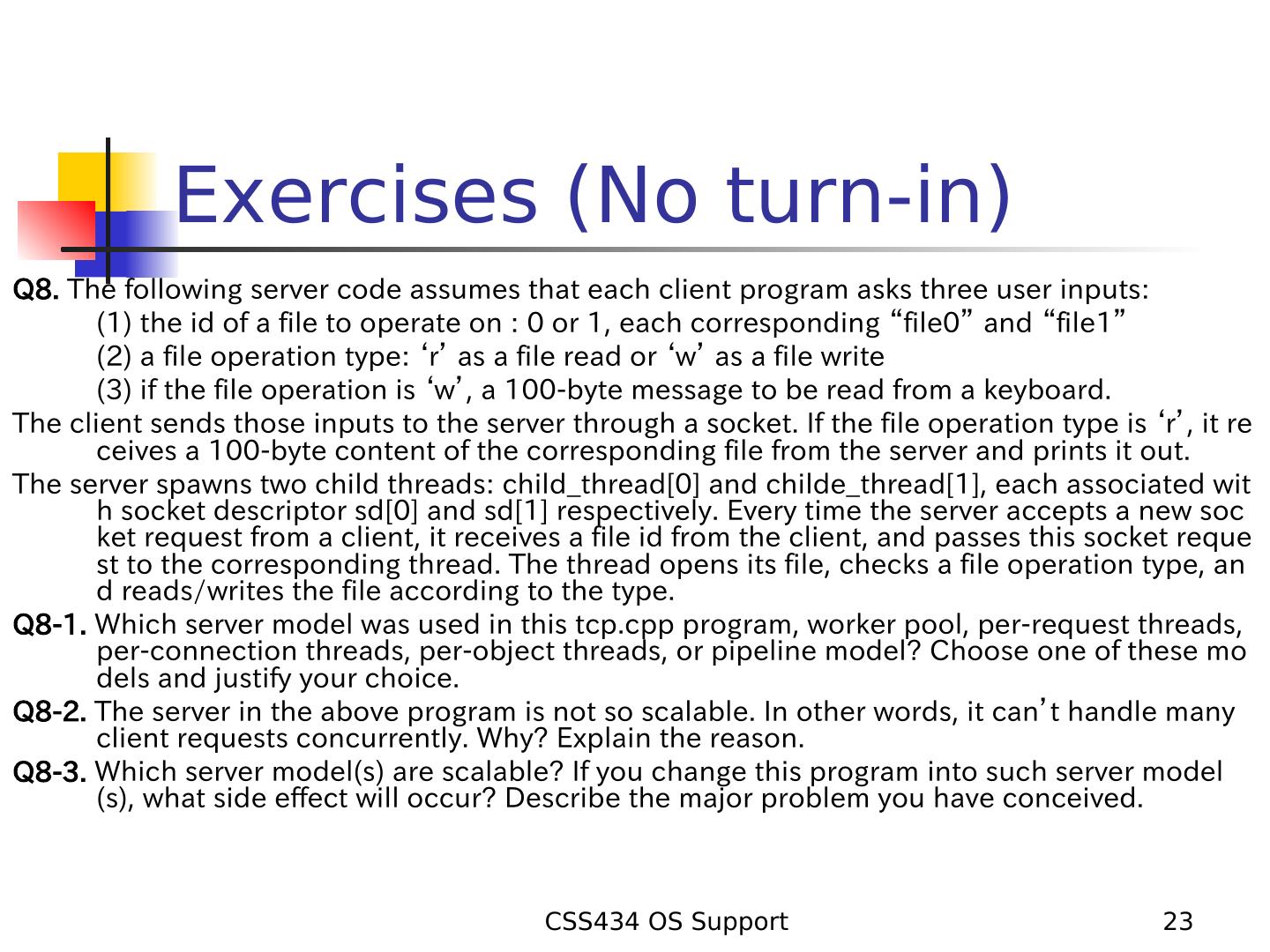 23 . Exercises (No turn-in) Q8. The following server code assumes that each client program asks three user inputs: (1) the id of a file to operate on : 0 or 1, each corresponding “file0” and “file1” (2) a file operation type: ‘r’ as a file read or ‘w’ as a file write (3) if the file operation is ‘w’, a 100-byte message to be read from a keyboard. The client sends those inputs to the server through a socket. If the file operation type is ‘r’, it re ceives a 100-byte content of the corresponding file from the server and prints it out. The server spawns two child threads: child_thread[0] and childe_thread[1], each associated wit h socket descriptor sd[0] and sd[1] respectively. Every time the server accepts a new soc ket request from a client, it receives a file id from the client, and passes this socket reque st to the corresponding thread. The thread opens its file, checks a file operation type, an d reads/writes the file according to the type. Q8-1. Which server model was used in this tcp.cpp program, worker pool, per-request threads, per-connection threads, per-object threads, or pipeline model? Choose one of these mo dels and justify your choice. Q8-2. The server in the above program is not so scalable. In other words, it can’t handle many client requests concurrently. Why? Explain the reason. Q8-3. Which server model(s) are scalable? If you change this program into such server model (s), what side effect will occur? Describe the major problem you have conceived. CSS434 OS Support 23