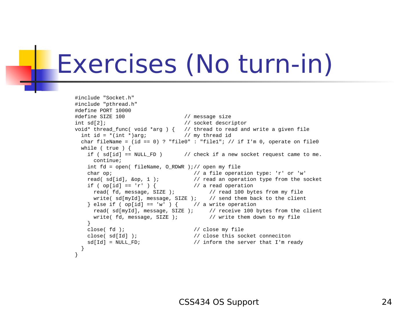 24 .Exercises (No turn-in) #include "Socket.h" #include "pthread.h" #define PORT 10000 #define SIZE 100 // message size int sd[2]; // socket descriptor void* thread_func( void *arg ) { // thread to read and write a given file int id = *(int *)arg; // my thread id char fileName = (id == 0) ? "file0" : "file1"; // if I'm 0, operate on file0 while ( true ) { if ( sd[id] == NULL_FD ) // check if a new socket request came to me. continue; int fd = open( fileName, O_RDWR );// open my file char op; // a file operation type: 'r' or 'w' read( sd[id], &op, 1 ); // read an operation type from the socket if ( op[id] == 'r' ) { // a read operation read( fd, message, SIZE ); // read 100 bytes from my file write( sd[myId], message, SIZE ); // send them back to the client } else if ( op[id] == 'w' ) { // a write operation read( sd[myId], message, SIZE ); // receive 100 bytes from the client write( fd, message, SIZE ); // write them down to my file } close( fd ); // close my file close( sd[Id] ); // close this socket conneciton sd[Id] = NULL_FD; // inform the server that I'm ready } } CSS434 OS Support 24