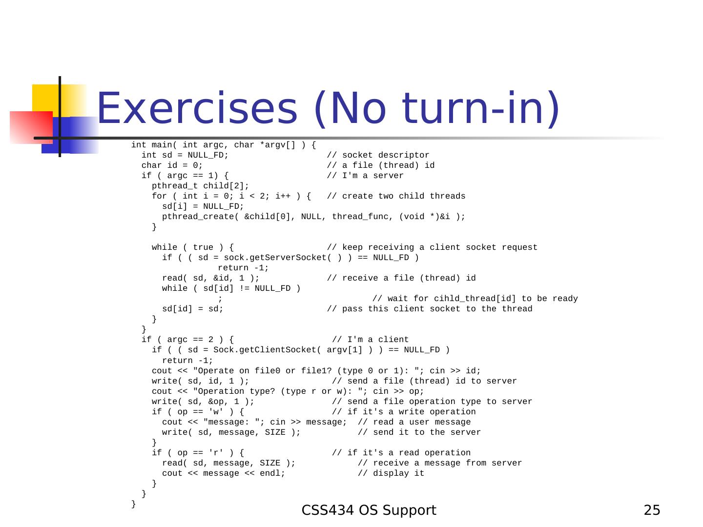 25 .Exercises (No turn-in) int main( int argc, char *argv[] ) { int sd = NULL_FD; // socket descriptor char id = 0; // a file (thread) id if ( argc == 1) { // I'm a server pthread_t child[2]; for ( int i = 0; i < 2; i++ ) { // create two child threads sd[i] = NULL_FD; pthread_create( &child[0], NULL, thread_func, (void *)&i ); } while ( true ) { // keep receiving a client socket request if ( ( sd = sock.getServerSocket( ) ) == NULL_FD ) return -1; read( sd, &id, 1 ); // receive a file (thread) id while ( sd[id] != NULL_FD ) ; // wait for cihld_thread[id] to be ready sd[id] = sd; // pass this client socket to the thread } } if ( argc == 2 ) { // I'm a client if ( ( sd = Sock.getClientSocket( argv[1] ) ) == NULL_FD ) return -1; cout << "Operate on file0 or file1? (type 0 or 1): "; cin >> id; write( sd, id, 1 ); // send a file (thread) id to server cout << "Operation type? (type r or w): "; cin >> op; write( sd, &op, 1 ); // send a file operation type to server if ( op == 'w' ) { // if it's a write operation cout << "message: "; cin >> message; // read a user message write( sd, message, SIZE ); // send it to the server } if ( op == 'r' ) { // if it's a read operation read( sd, message, SIZE ); // receive a message from server cout << message << endl; // display it } } } CSS434 OS Support 25