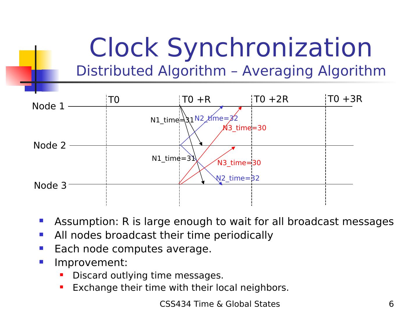 6 . Clock Synchronization Distributed Algorithm – Averaging Algorithm T0 T0 +R T0 +2R T0 +3R Node 1 N1_time=31 N2_time=32 N3_time=30 Node 2 N1_time=31 N3_time=30 N2_time=32 Node 3 Assumption: R is large enough to wait for all broadcast messages All nodes broadcast their time periodically Each node computes average. Improvement: Discard outlying time messages. Exchange their time with their local neighbors. CSS434 Time & Global States 6