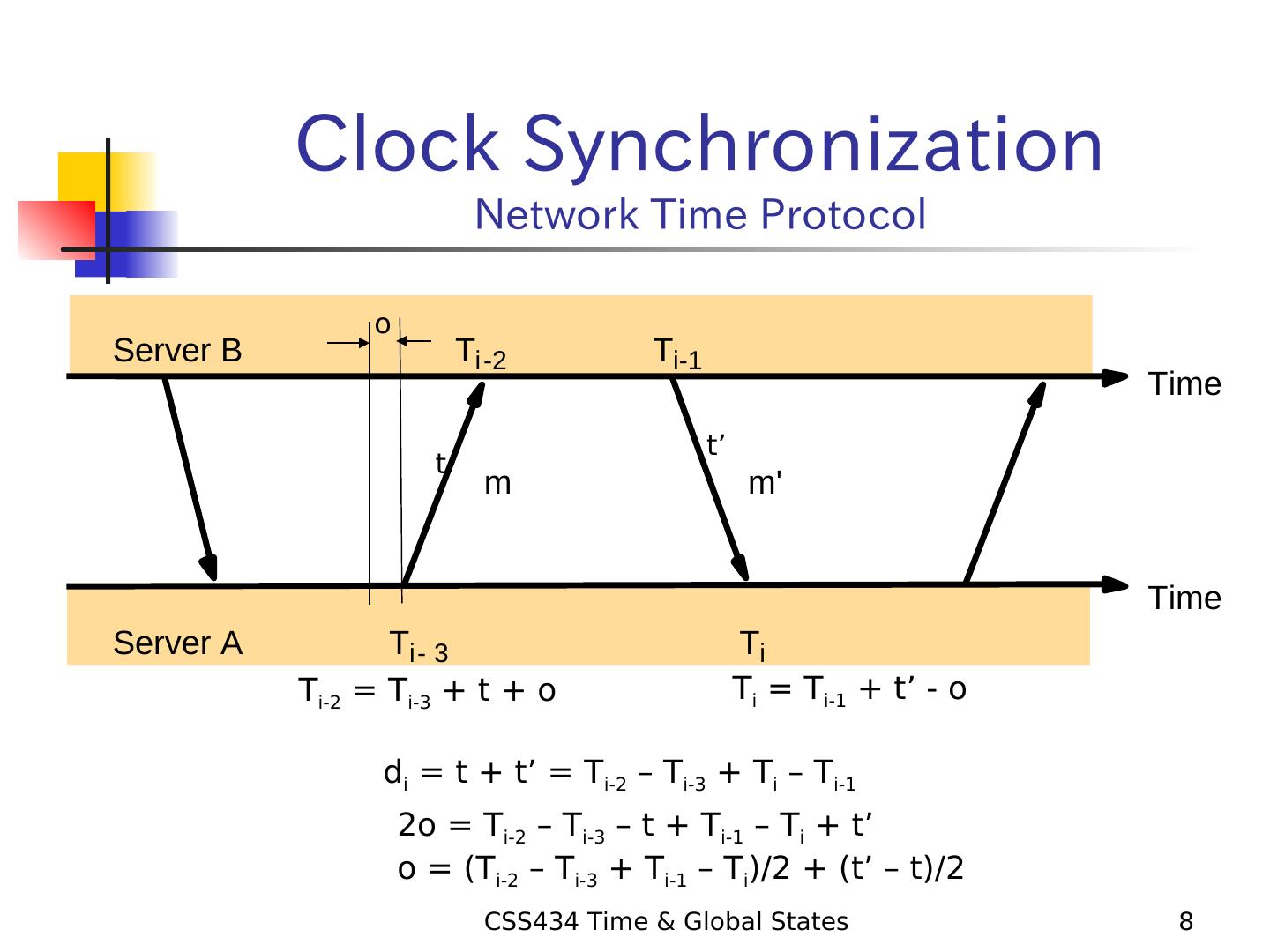 8 . Clock Synchronization Network Time Protocol o Server B Ti-2 Ti-1 Time t’ t m m' Time Server A Ti- 3 Ti Ti-2 = Ti-3 + t + o Ti = Ti-1 + t’ - o di = t + t’ = Ti-2 – Ti-3 + Ti – Ti-1 2o = Ti-2 – Ti-3 – t + Ti-1 – Ti + t’ o = (Ti-2 – Ti-3 + Ti-1 – Ti)/2 + (t’ – t)/2 CSS434 Time & Global States 8