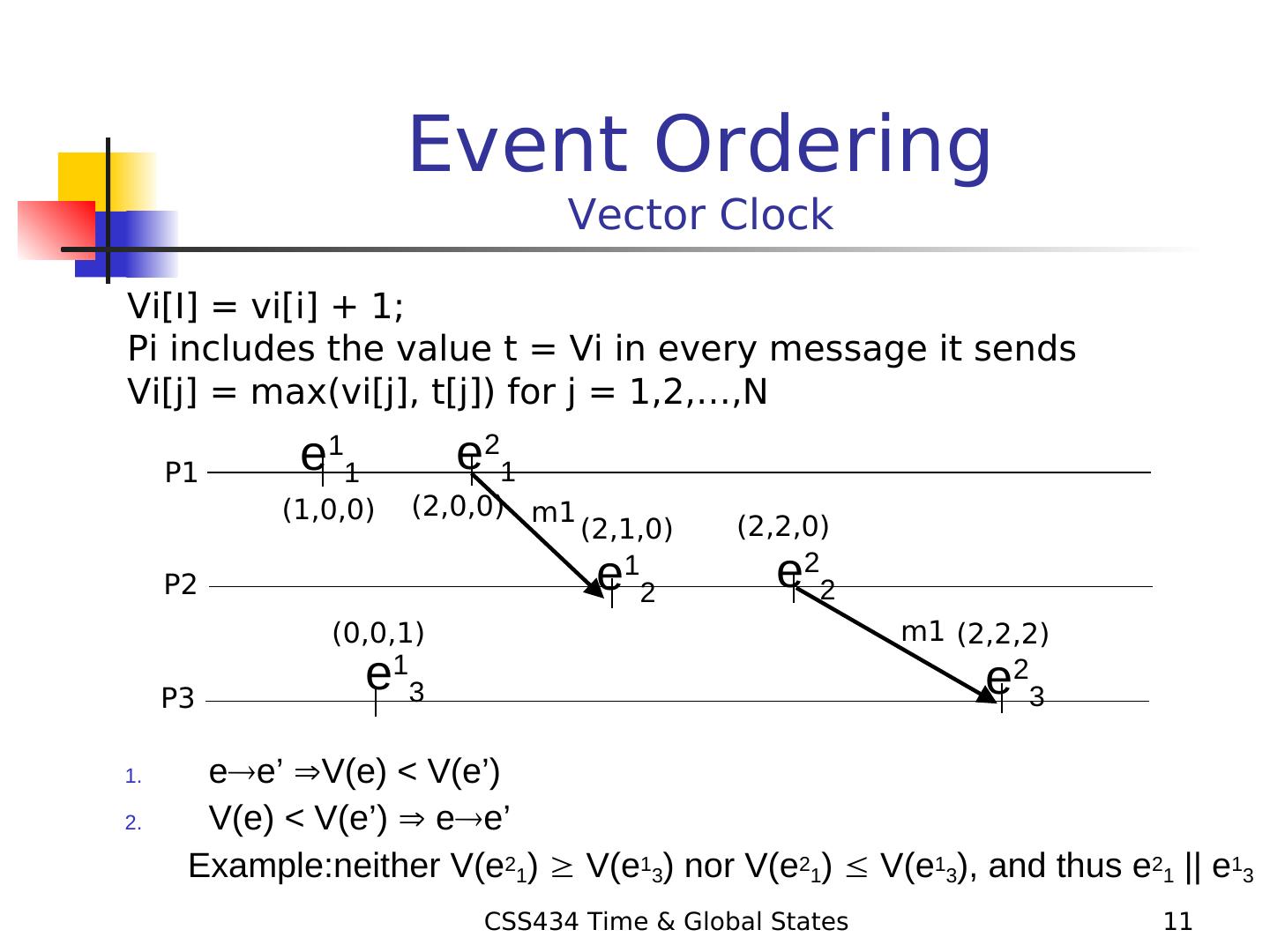 10 . Event Ordering Logical Clock LC(ei) := (ei != receive(m)) ? LC + 1 : max(LC, TS(m)) + 1 where TS(m) is the timestamp of message m: P1 e11 e21 LC=1 LC=2 m1 P2 e12 e22 LC=3 LC=4 m1 P3 e13 e23 LC=1 LC=5 1. ee’ LC(e) < LC(e’) for all events 2. However, we cannot inferLC(e) < LC(e’) ee’ Example: LC(e21) > LC(e13) but e21 || e13 CSS434 Time & Global States 10