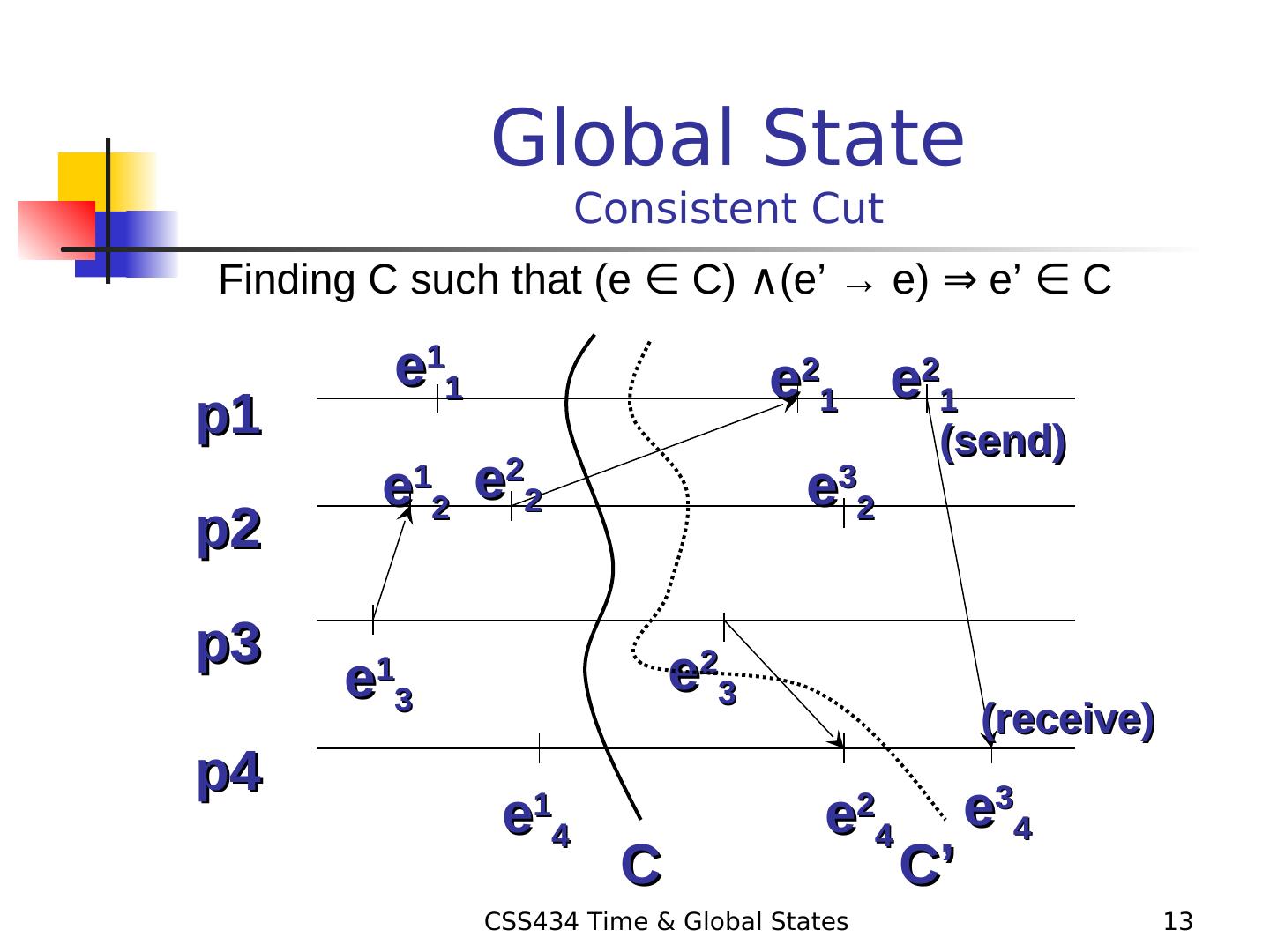 13 . Global State Consistent Cut Finding C such that (e ∈ C) ∧(e’ → e) ⇒ e’ ∈ C C) ∧(e’ → e) ⇒ e’ ∈ C(e’ → e) ⇒ e’ ∈ C e’ ∈ C) ∧(e’ → e) ⇒ e’ ∈ C C e11 e21 e21 p1 (send) e12 e22 e32 p2 p3 e13 e23 (receive) p4 e 1 4 e 2 4 e34 C C’ CSS434 Time & Global States 13