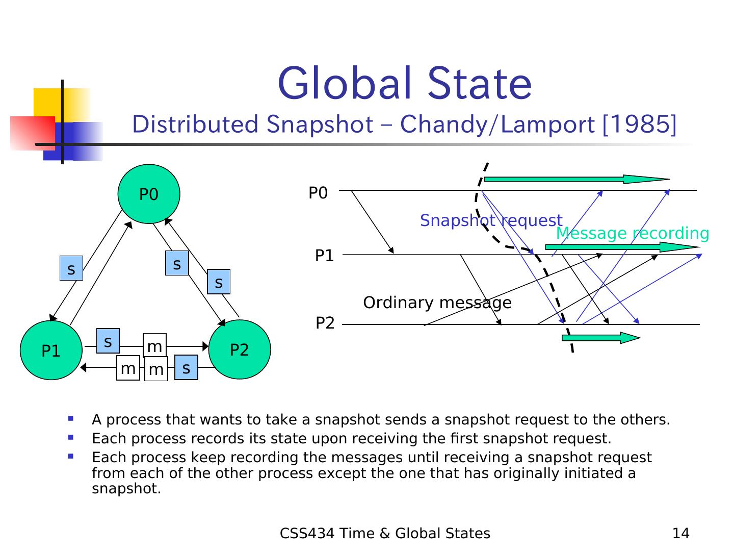12 . Global State Applications necessary to detect a correct global state p1 p2 object reference message a. Garbage collection garbage object This is not a garbage, because p1 p2 wait-forthe in-transit message points to it b. Deadlock wait-for Both p1 and p2 are passive and thus seems ready to finish, but an in-transit message makes p1 active again. p1 p2 activate c. Termination passive passive CSS434 Time & Global States 12