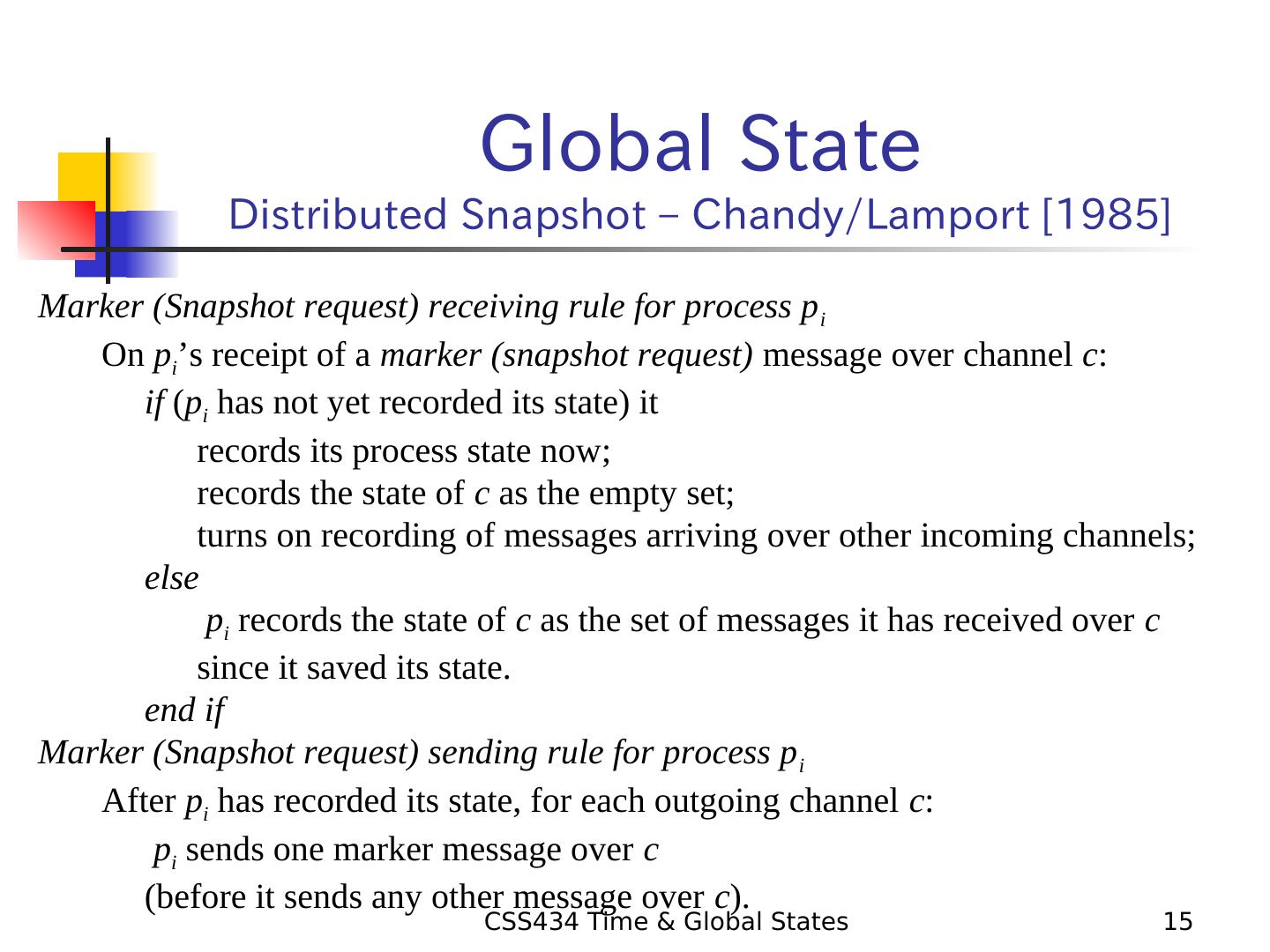 14 . Global State Distributed Snapshot – Chandy/Lamport [1985] P0 P0 Snapshot request Message recording s P1 s s Ordinary message P2 s m P1 P2 m m s A process that wants to take a snapshot sends a snapshot request to the others. Each process records its state upon receiving the first snapshot request. Each process keep recording the messages until receiving a snapshot request from each of the other process except the one that has originally initiated a snapshot. CSS434 Time & Global States 14