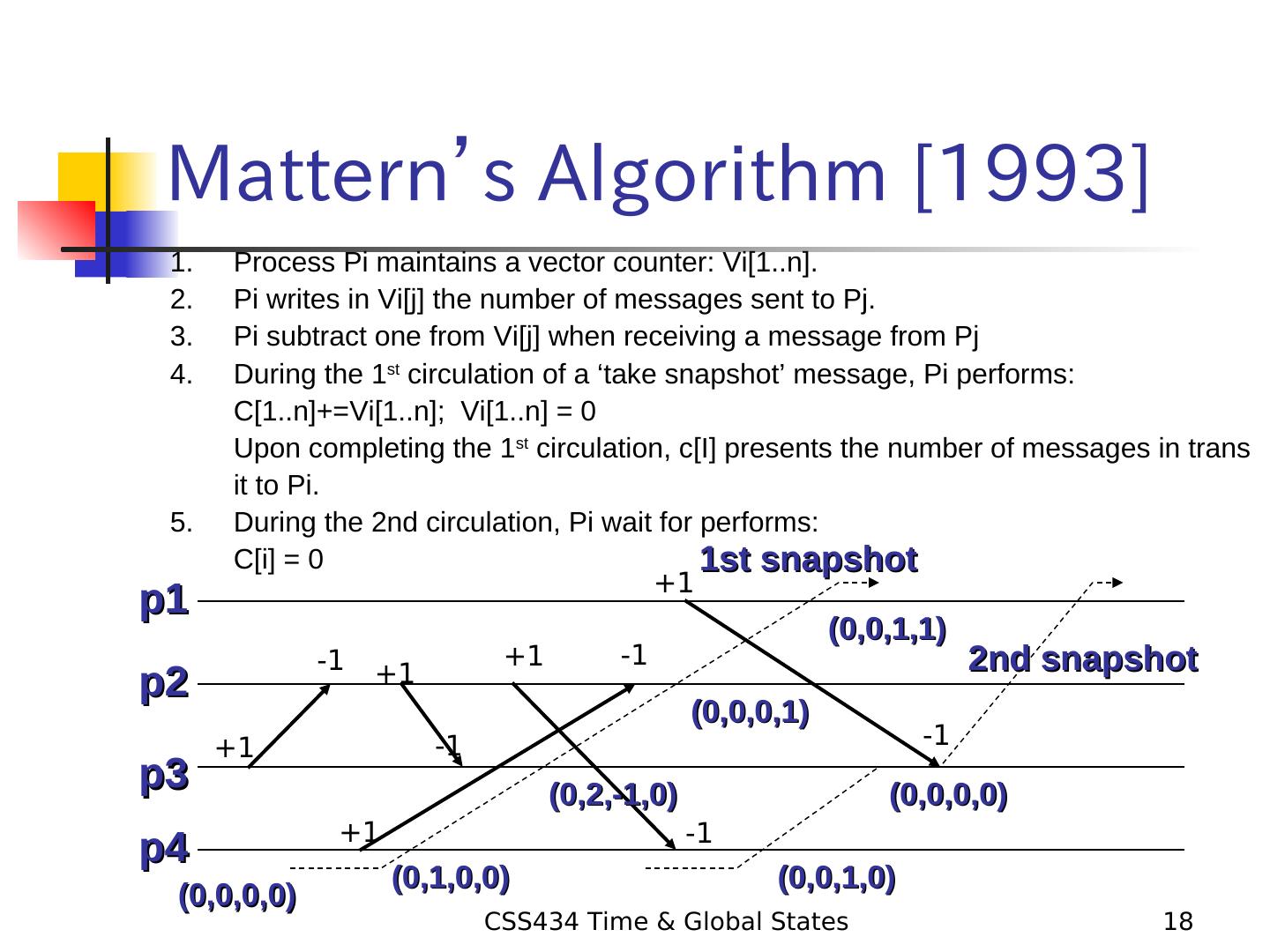 18 . Mattern’s Algorithm [1993] 1. Process Pi maintains a vector counter: Vi[1..n]. 2. Pi writes in Vi[j] the number of messages sent to Pj. 3. Pi subtract one from Vi[j] when receiving a message from Pj 4. During the 1st circulation of a ‘take snapshot’ message, Pi performs: C[1..n]+=Vi[1..n]; Vi[1..n] = 0 Upon completing the 1st circulation, c[I] presents the number of messages in trans it to Pi. 5. During the 2nd circulation, Pi wait for performs: C[i] = 0 1st snapshot +1 p1 (0,0,1,1) -1 +1 +1 -1 2nd snapshot p2 (0,0,0,1) +1 -1 -1 p3 (0,2,-1,0) (0,0,0,0) +1 -1 p4 (0,1,0,0) (0,0,1,0) (0,0,0,0) CSS434 Time & Global States 18