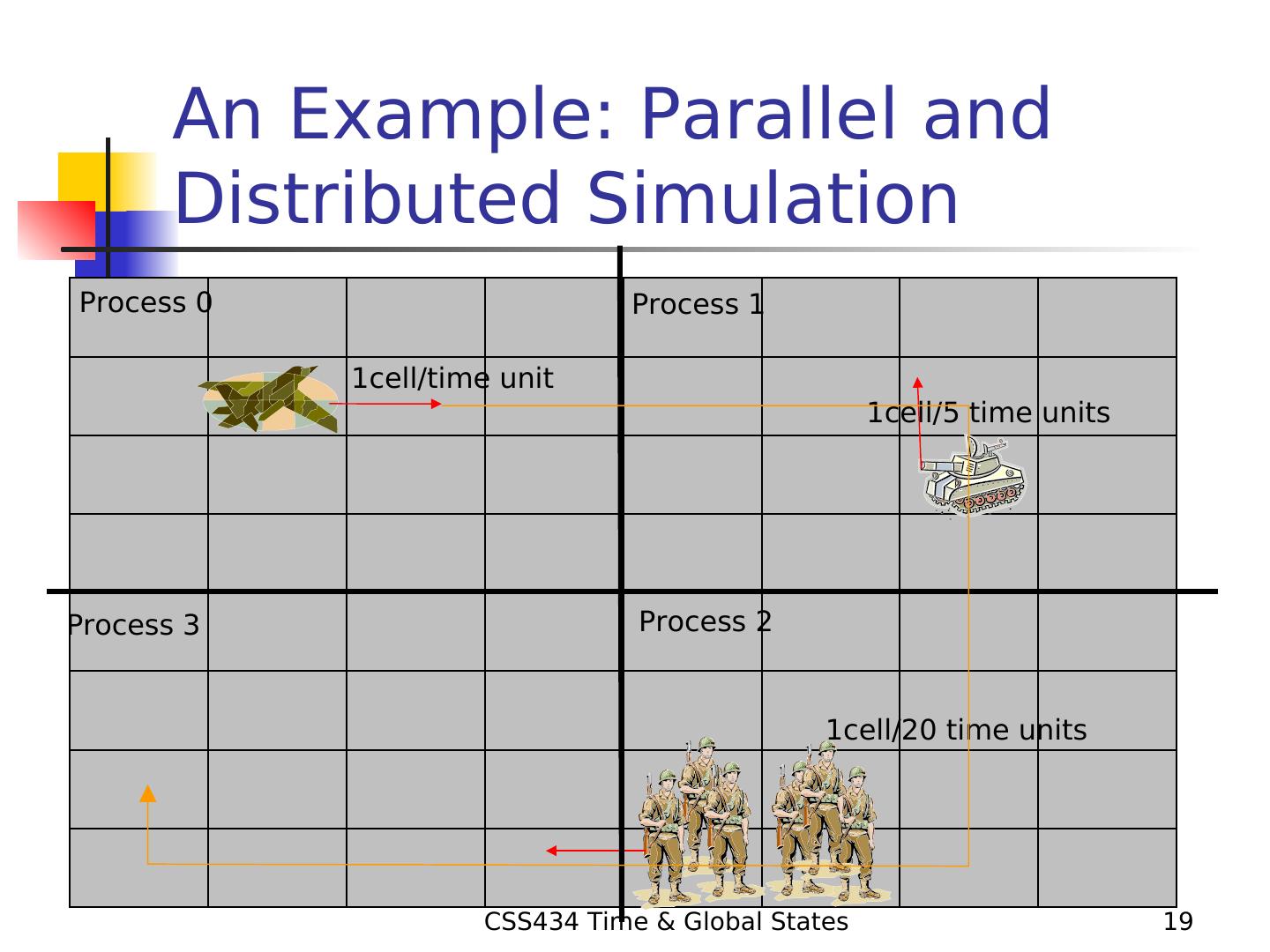 19 . An Example: Parallel and Distributed Simulation Process 0 Process 1 1cell/time unit 1cell/5 time units Process 3 Process 2 1cell/20 time units CSS434 Time & Global States 19
