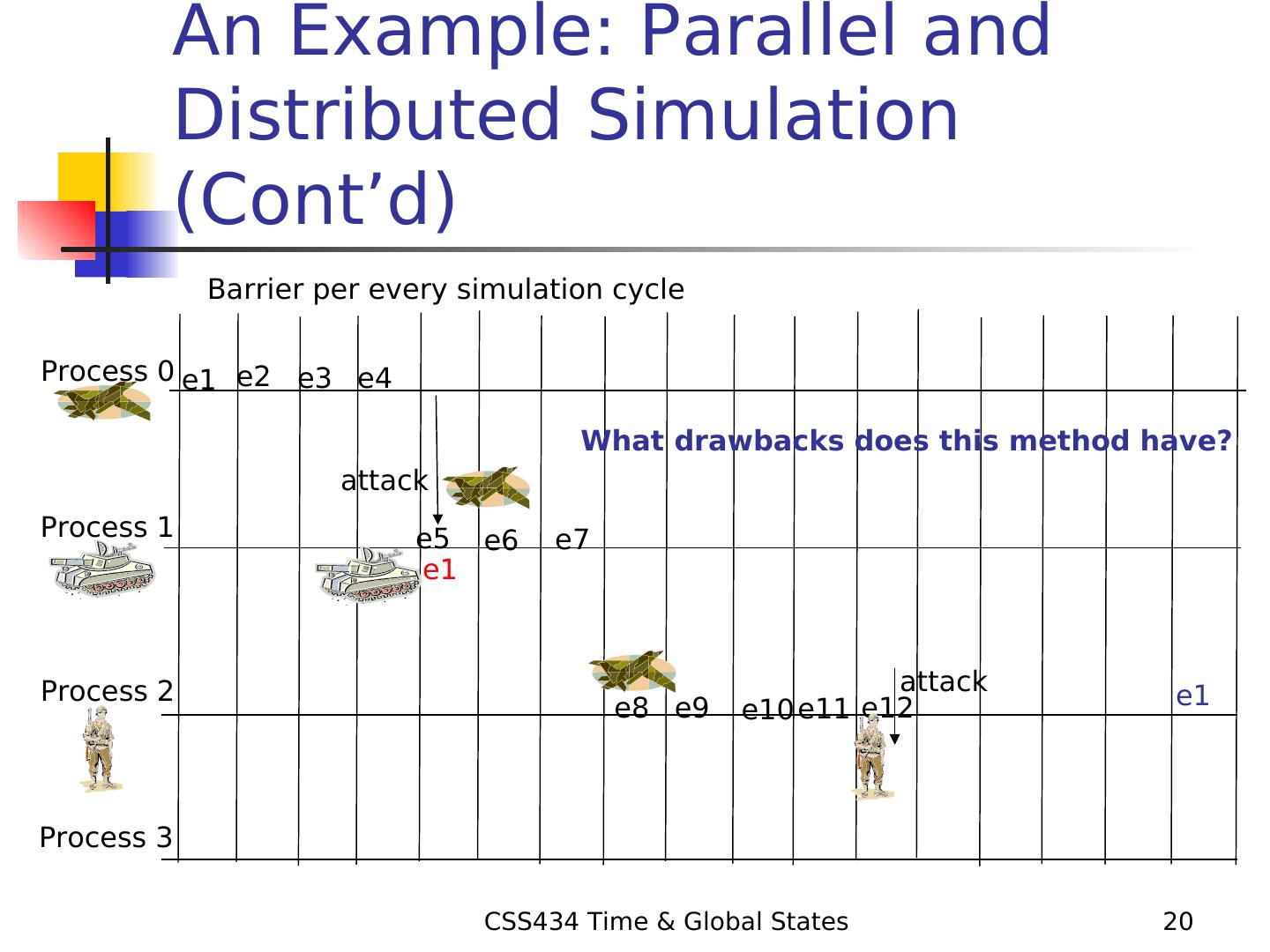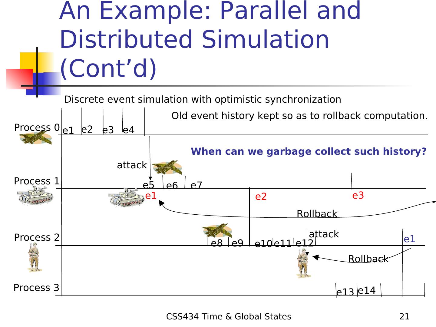 20 . An Example: Parallel and Distributed Simulation (Cont’d) Barrier per every simulation cycle Process 0 e1 e2 e3 e4 What drawbacks does this method have? attack Process 1 e5 e6 e7 e1 Process 2 attack e1 e8 e9 e10 e11 e12 Process 3 CSS434 Time & Global States 20