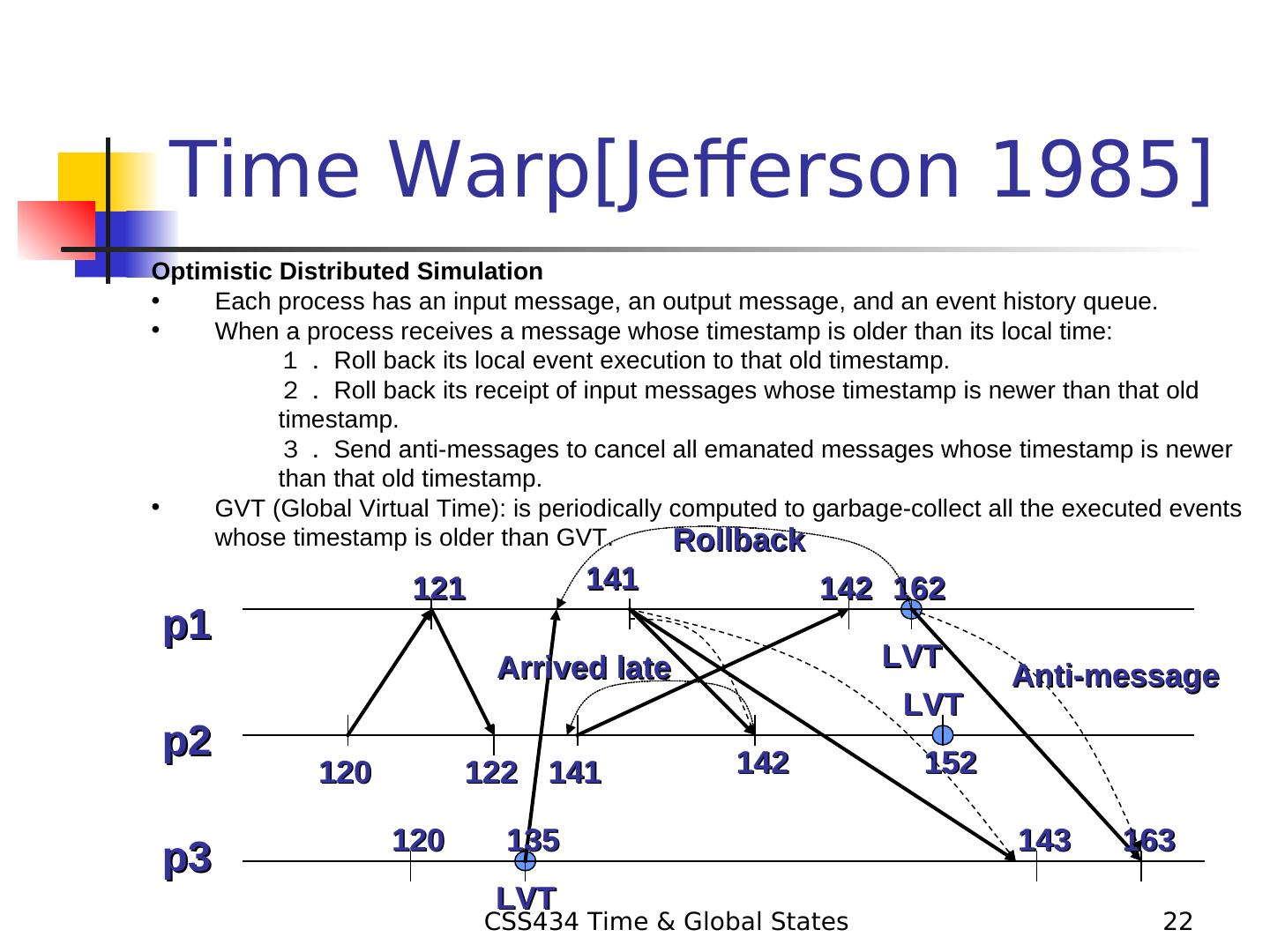 22 . Time Warp[Jefferson 1985] Optimistic Distributed Simulation • Each process has an input message, an output message, and an event history queue. • When a process receives a message whose timestamp is older than its local time: 1. Roll back its local event execution to that old timestamp. 2. Roll back its receipt of input messages whose timestamp is newer than that old timestamp. 3. Send anti-messages to cancel all emanated messages whose timestamp is newer than that old timestamp. • GVT (Global Virtual Time): is periodically computed to garbage-collect all the executed events whose timestamp is older than GVT. Rollback 121 141 142 162 p1 Arrived late LVT Anti-message LVT p2 142 152 120 122 141 120 135 143 163 p3 LVT CSS434 Time & Global States 22