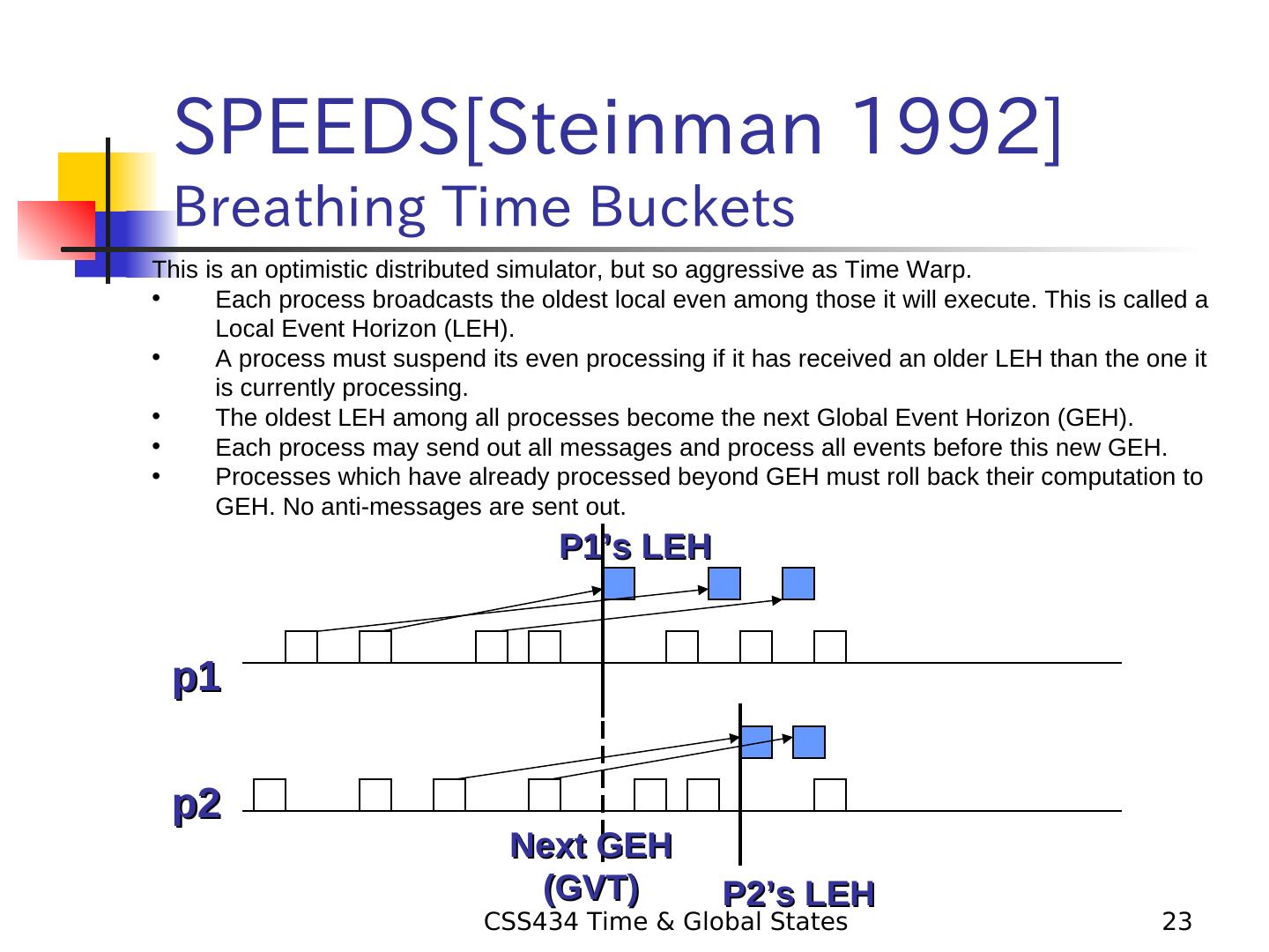 23 . SPEEDS[Steinman 1992] Breathing Time Buckets This is an optimistic distributed simulator, but so aggressive as Time Warp. • Each process broadcasts the oldest local even among those it will execute. This is called a Local Event Horizon (LEH). • A process must suspend its even processing if it has received an older LEH than the one it is currently processing. • The oldest LEH among all processes become the next Global Event Horizon (GEH). • Each process may send out all messages and process all events before this new GEH. • Processes which have already processed beyond GEH must roll back their computation to GEH. No anti-messages are sent out. P1’s LEH p1 p2 Next GEH (GVT) P2’s LEH CSS434 Time & Global States 23