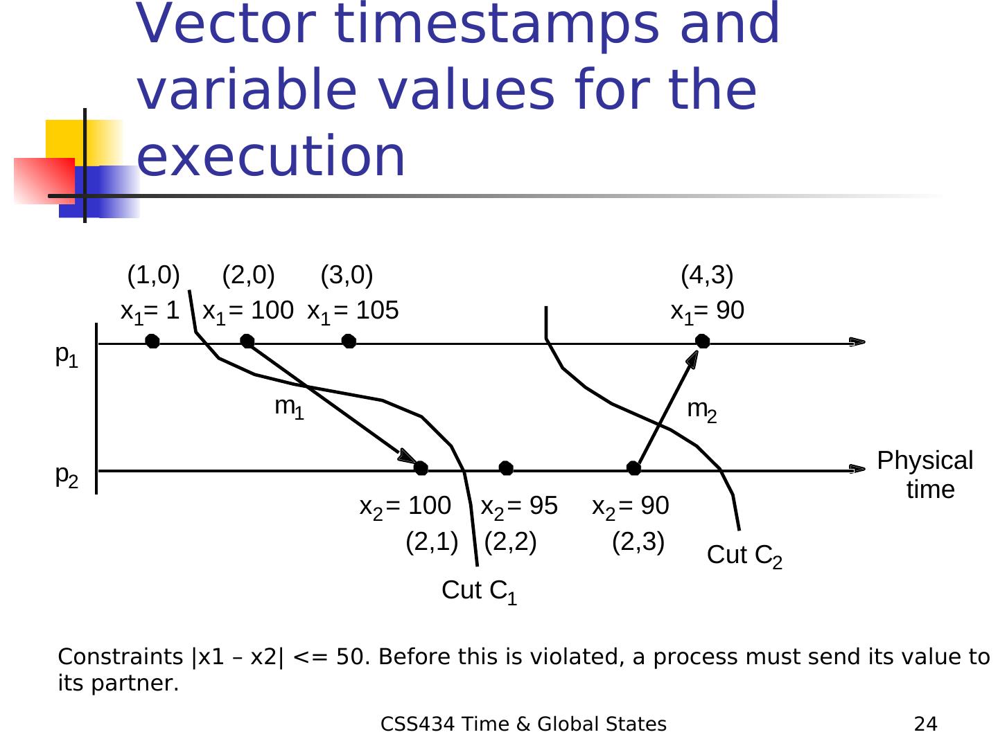 24 . Vector timestamps and variable values for the execution (1,0) (2,0) (3,0) (4,3) x1= 1 x1 = 100 x1 = 105 x1= 90 p1 m1 m2 p2 Physical time x2 = 100 x2 = 95 x2 = 90 (2,1) (2,2) (2,3) Cut C2 Cut C1 Constraints |x1 – x2| <= 50. Before this is violated, a process must send its value to its partner. CSS434 Time & Global States 24