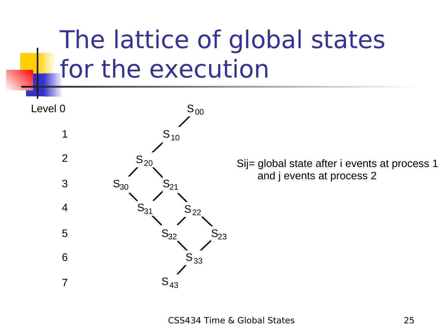 25 . The lattice of global states for the execution Level 0 S 00 1 S 10 2 S 20 Sij= global state after i events at process 1 and j events at process 2 3 S30 S21 4 S31 S 22 5 S32 S23 6 S 33 7 S 43 CSS434 Time & Global States 25