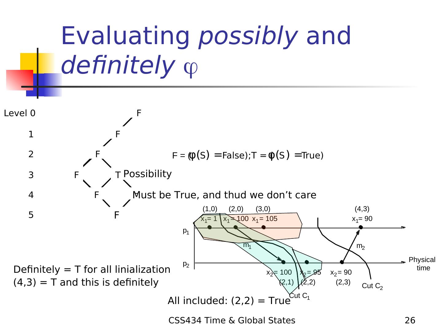 26 . Evaluating possibly and definitely Level 0 F 1 F 2 F F = (φ(S) =False);T = φ( ( S ) =True) 3 F T Possibility 4 F – Must be True, and thud we don’t care (1,0) (2,0) (3,0) (4,3) 5 ?F x1= 1 x1 = 100 x1 = 105 x1= 90 p1 m1 m2 p2 Physical Definitely = T for all linialization x2 = 100 x2 = 95 x2 = 90 time (4,3) = T and this is definitely (2,1) (2,2) (2,3) Cut C2 Cut C1 All included: (2,2) = True CSS434 Time & Global States 26