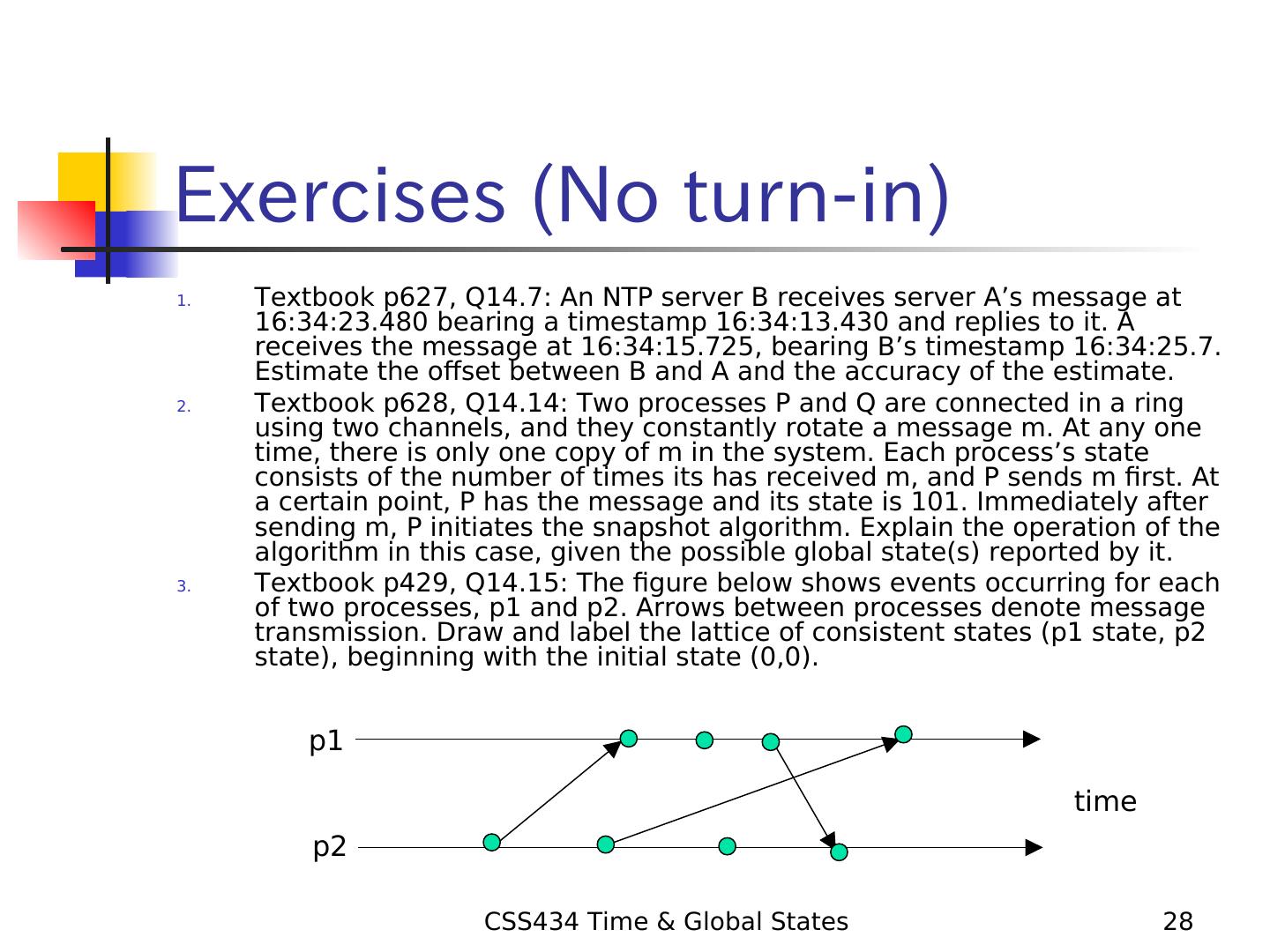 28 .Exercises (No turn-in) 1. Textbook p627, Q14.7: An NTP server B receives server A’s message at 16:34:23.480 bearing a timestamp 16:34:13.430 and replies to it. A receives the message at 16:34:15.725, bearing B’s timestamp 16:34:25.7. Estimate the offset between B and A and the accuracy of the estimate. 2. Textbook p628, Q14.14: Two processes P and Q are connected in a ring using two channels, and they constantly rotate a message m. At any one time, there is only one copy of m in the system. Each process’s state consists of the number of times its has received m, and P sends m first. At a certain point, P has the message and its state is 101. Immediately after sending m, P initiates the snapshot algorithm. Explain the operation of the algorithm in this case, given the possible global state(s) reported by it. 3. Textbook p429, Q14.15: The figure below shows events occurring for each of two processes, p1 and p2. Arrows between processes denote message transmission. Draw and label the lattice of consistent states (p1 state, p2 state), beginning with the initial state (0,0). p1 time p2 CSS434 Time & Global States 28