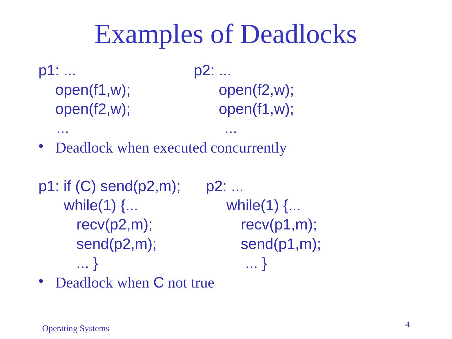 4 .Operating Systems 4 Examples of Deadlocks p1: ... p2: ... open(f1,w); open(f2,w); open(f2,w); open(f1,w); ... ... Deadlock when executed concurrently p1: if (C) send(p2,m); p2: ... while(1) {... while(1) {... recv (p2,m); recv (p1,m); send(p2,m); send(p1,m); ... } ... } Deadlock when C not true