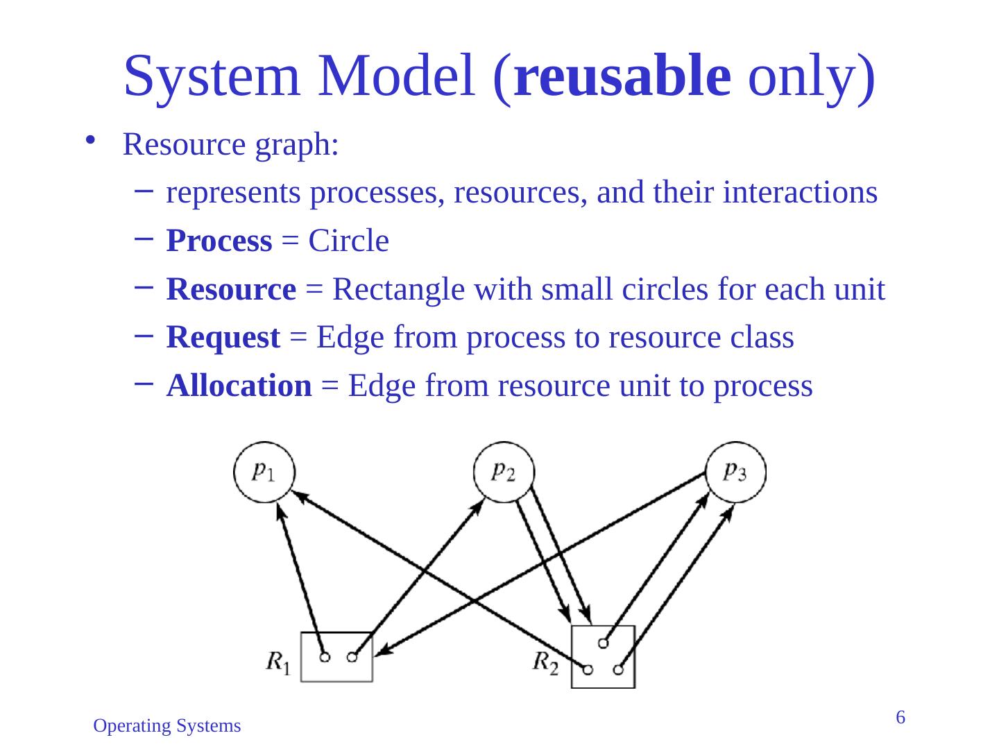 6 .Operating Systems 6 System Model ( reusable only) Resource graph: represents processes, resources, and their interactions Process = Circle Resource = Rectangle with small circles for each unit Request = Edge from process to resource class Allocation = Edge from resource unit to process