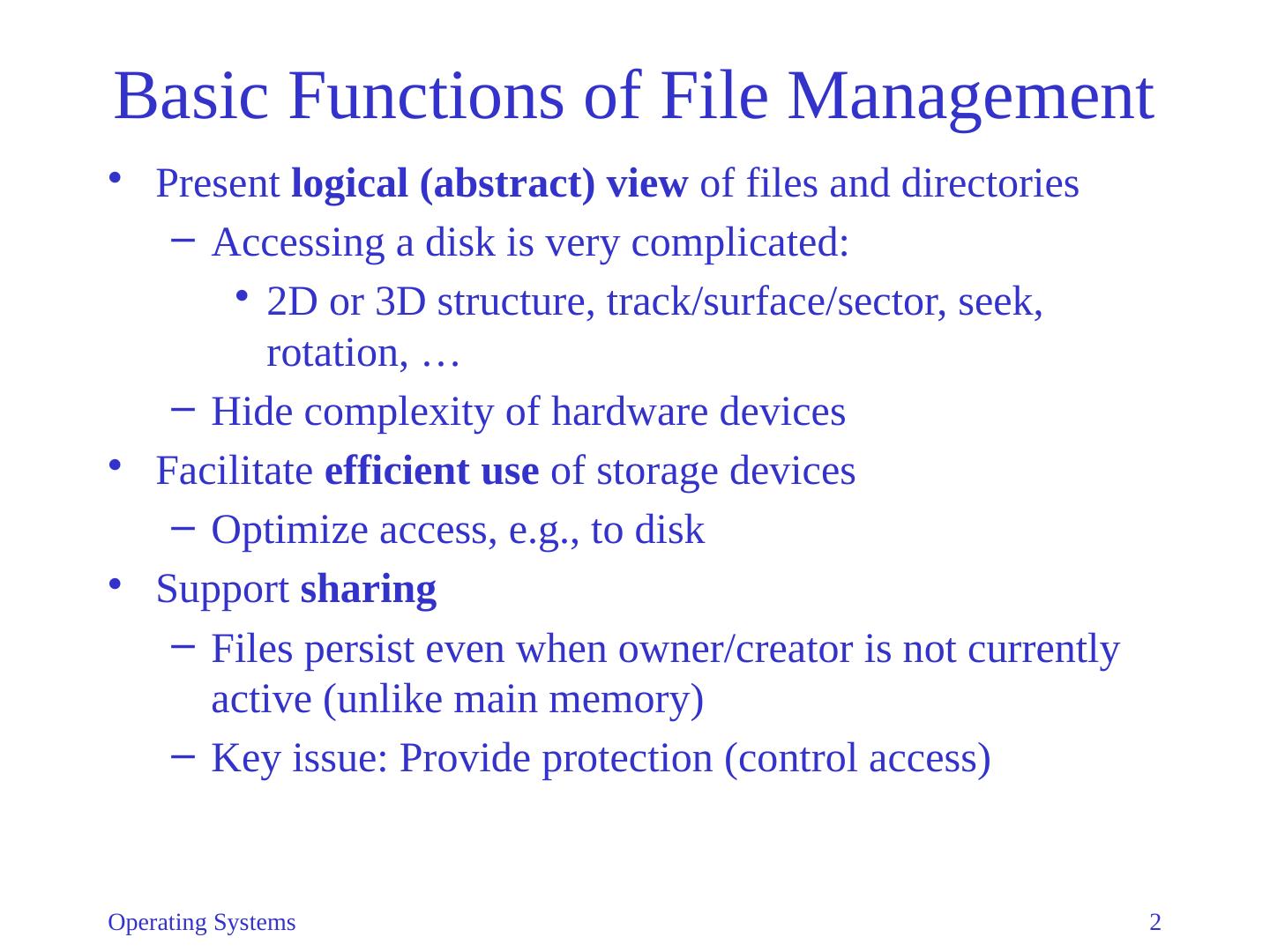 2 .Operating Systems 2 Basic Functions of File Management Present logical (abstract) view of files and directories Accessing a disk is very complicated: 2D or 3D structure, track/surface/sector, seek, rotation, … Hide complexity of hardware devices Facilitate efficient use of storage devices Optimize access, e.g., to disk Support sharing Files persist even when owner/creator is not currently active (unlike main memory) Key issue: Provide protection (control access)