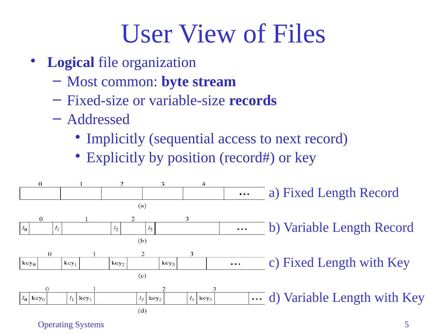 5 .Operating Systems 5 User View of Files Logical file organization Most common: byte stream Fixed-size or variable-size records Addressed Implicitly (sequential access to next record) Explicitly by position (record#) or key a) Fixed Length Record b) Variable Length Record c) Fixed Length with Key d) Variable Length with Key