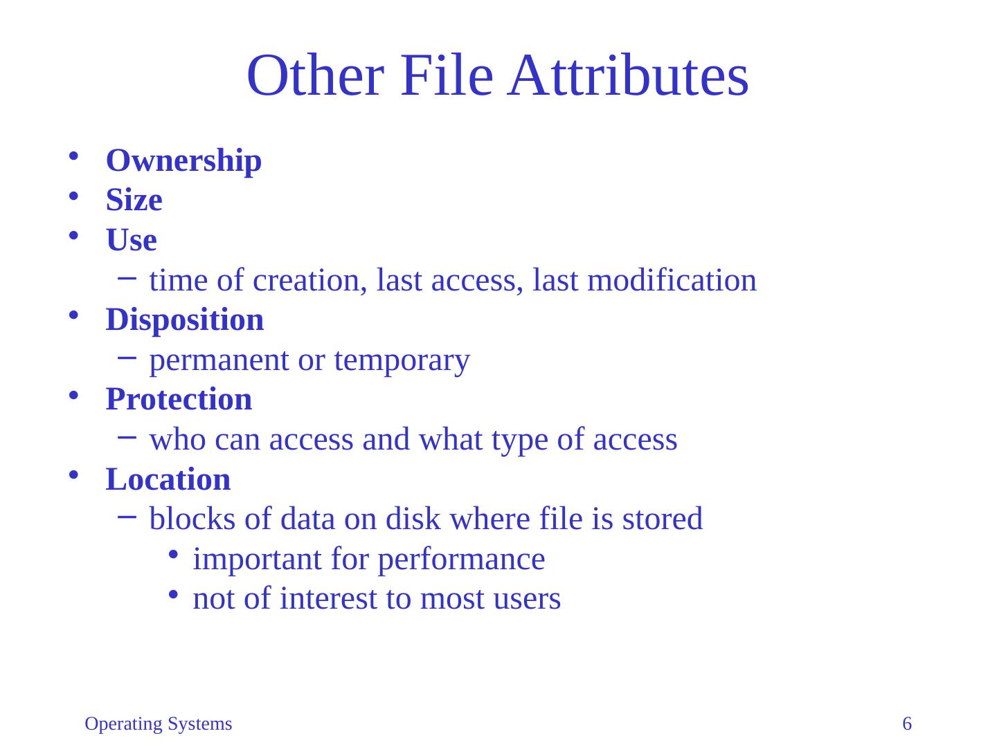 6 .Operating Systems 6 Other File Attributes Ownership Size Use t ime of creation, last access, last modification Disposition p ermanent or temporary Protection w ho can access and what type of access Location b locks of data on disk where file is stored i mportant for performance n ot of interest to most users