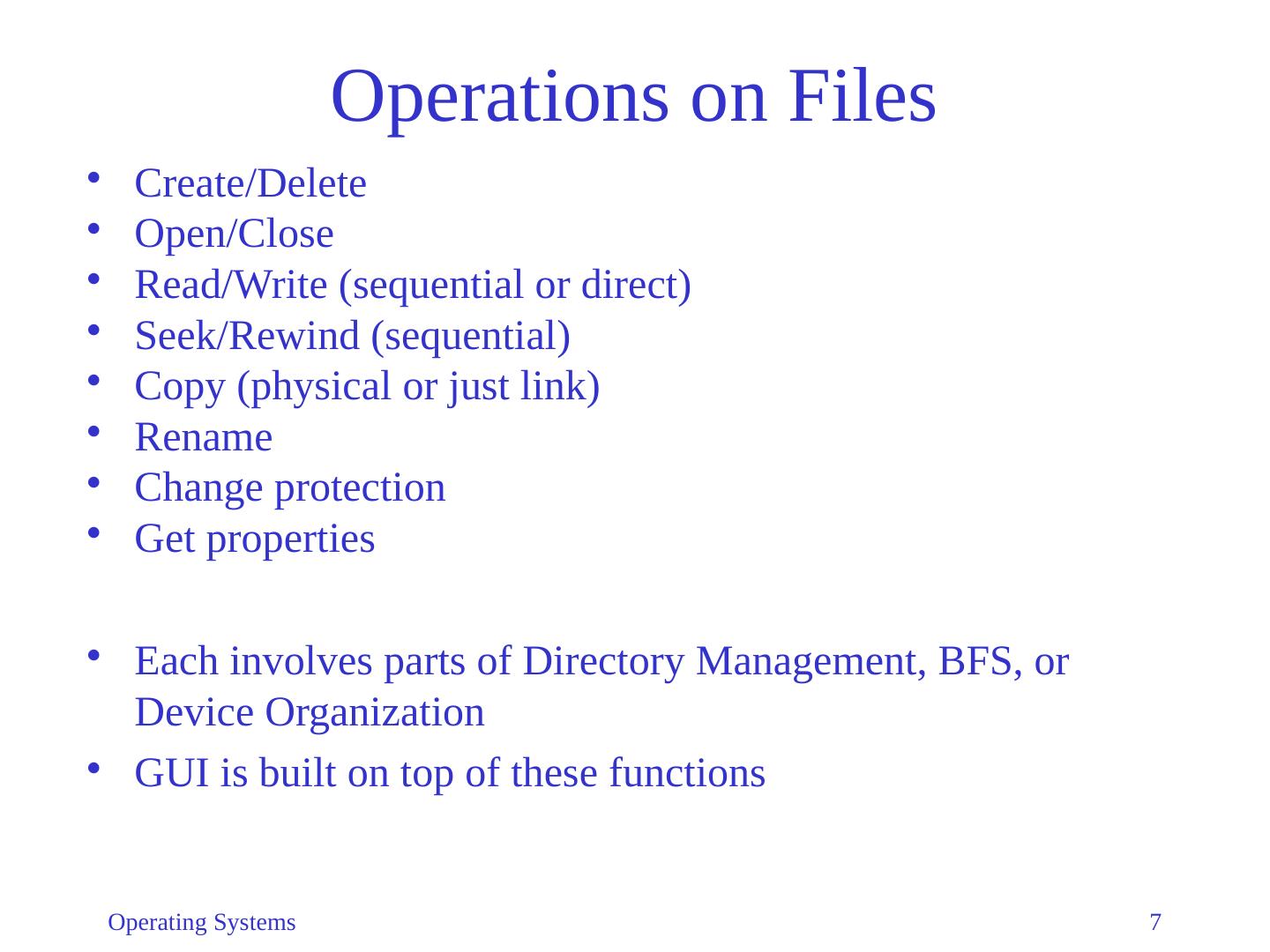 7 .Operating Systems 7 Operations on Files Create/Delete Open/Close Read/Write (sequential or direct) Seek/Rewind ( sequential) Copy (physical or just link) Rename Change protection Get properties Each involves parts of Directory Management, BFS, or Device Organization GUI is built on top of these functions