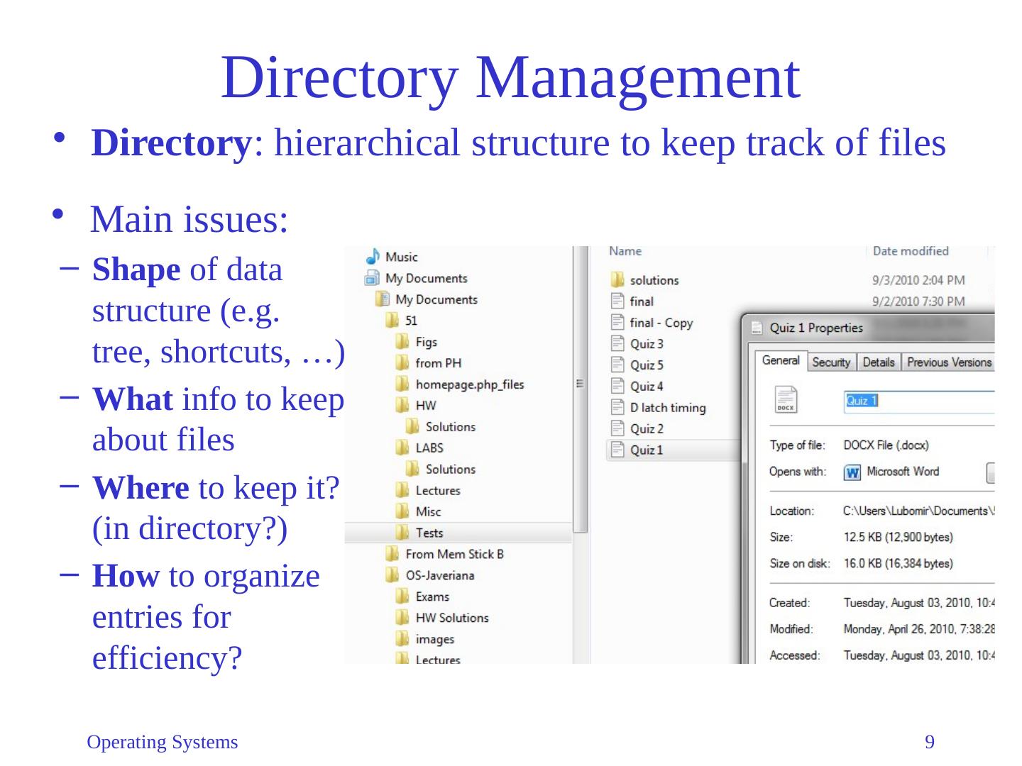 9 .Operating Systems 9 Directory Management Directory : hierarchical structure to keep track of files Main issues: Shape of data structure (e.g. tree , shortcuts, …) What info to keep about files Where to keep it? ( in directory ?) How to organize entries for efficiency?